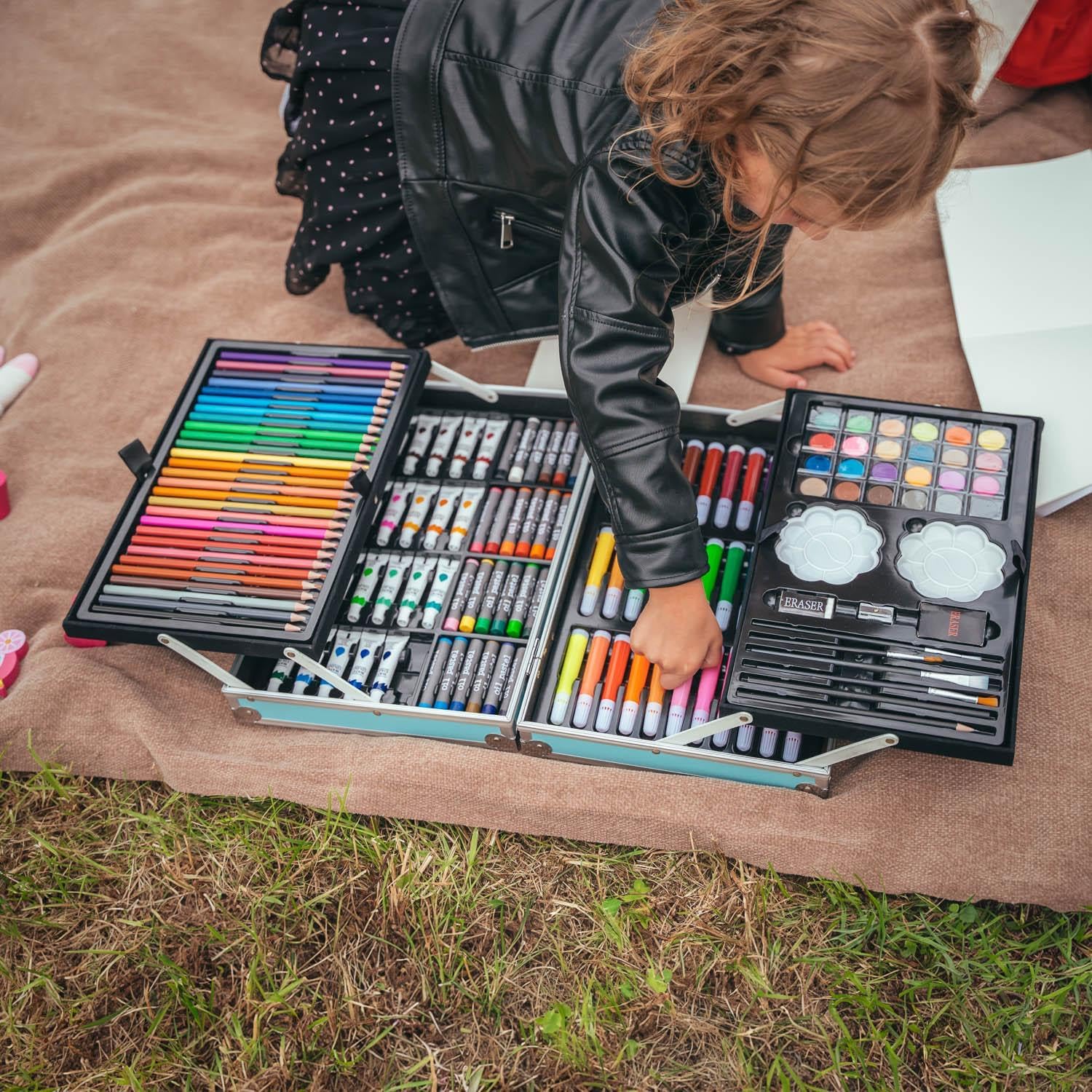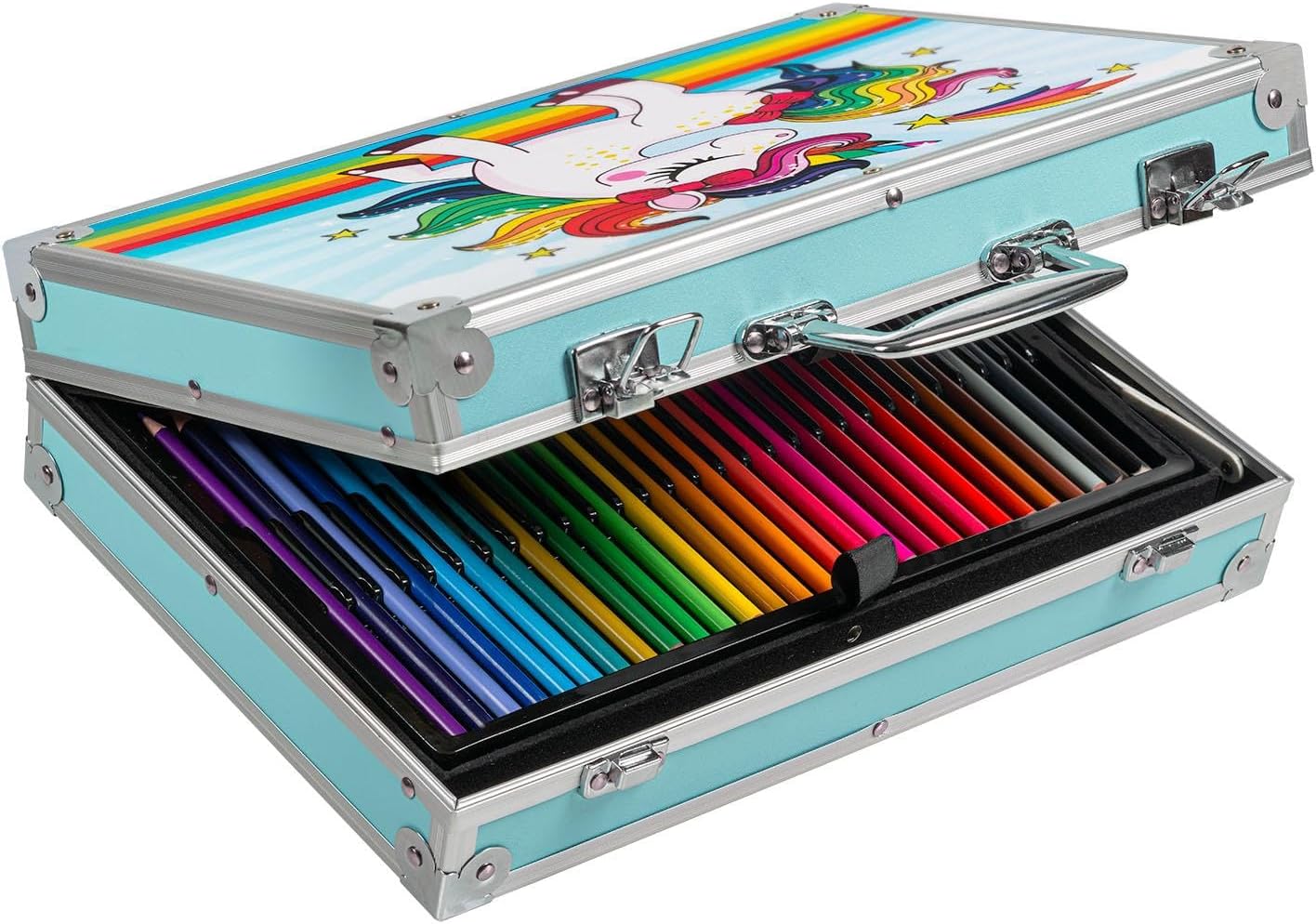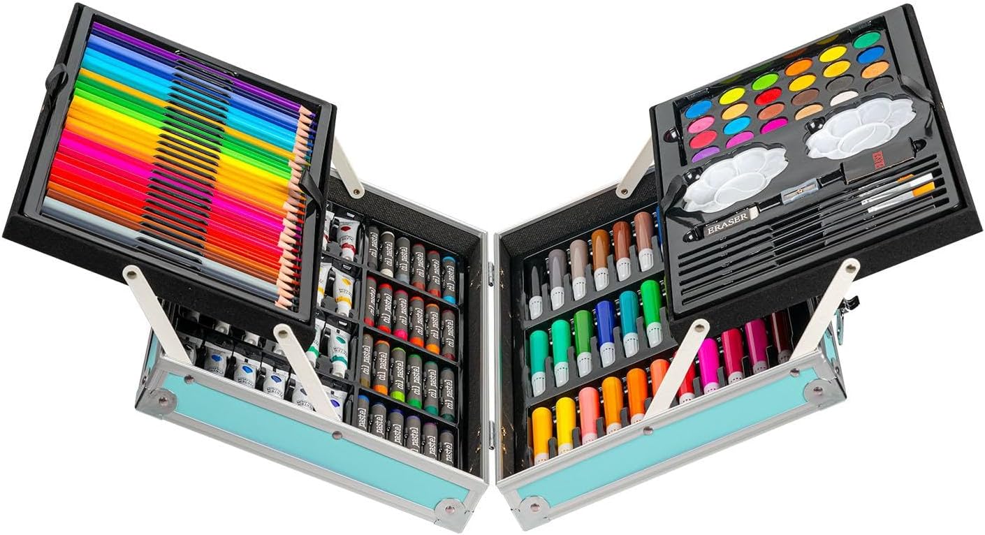 SET COMPLETO 144 PEZZI: include 28 matite colorate, 24 pastelli a cera, 33 pennarelli, 24 colori a tempera acquerellabile, 24 tavolette acquerello, 2 tavolozze, 4 pennelli, 2 matite da disegno, 1 gomma pane e 1 gomma classica. CUSTODIA IN ALLUMINIO PRATICA E RESISTENTE: mantiene tutti i colori in ordine e facilmente trasportabili ovunque. SUPPORTO PER TUTTE LE TECNICHE ARTISTICHE: vario e versatile. combina matite, pastelli, pennarelli, acquerelli e accessori per ogni tecnica artistica. REGALO CREATIVO IDEALE: ottima idea per compleanni, Natale e occasioni speciali per stimolare fantasia e talento artistico. AMPIA GAMMA DI COLORI– dai pastelli a cera agli acquerelli, offre infinite combinazioni per disegni vivaci e dettagliati.
