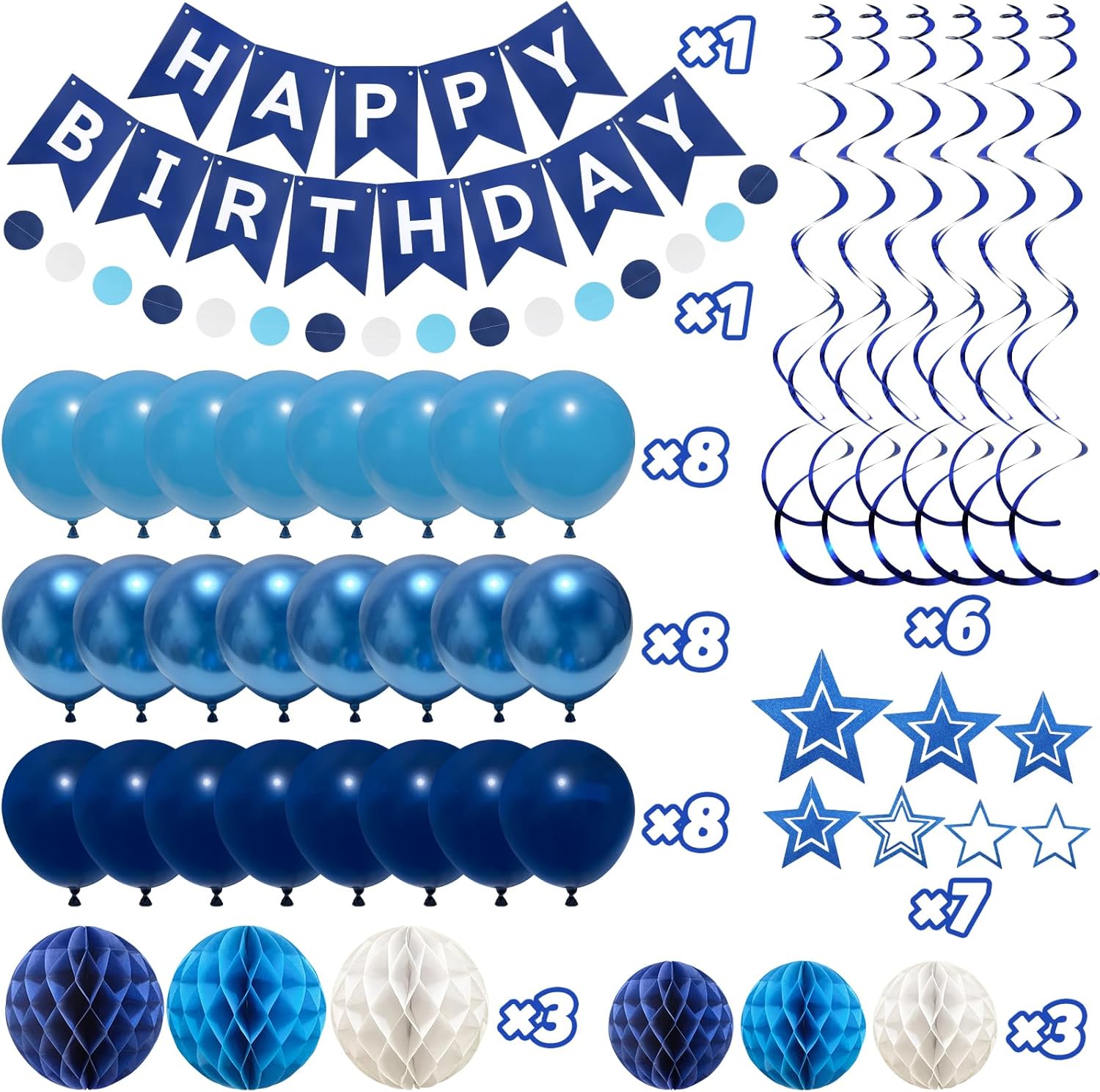 [Cosa otterrai] 1 striscione di buon compleanno, 6 palline di carta a nido d'ape, stelle filanti a 7 stelle, 6 turbinii sospesi, 24 palloncini, 1 ghirlanda a pois. (colore: blu) [Facile da montare] Queste palline e striscioni sospesi a nido d'ape in carta sono facili da aprire e fissare, basta aprire la pallina di carta e fissarla con la corda della pallina di carta. [Ottimo materiale] carta di alta qualità, pasta di legno pura ecologica, può essere utilizzata ripetutamente. Colori più brillanti, carta più spessa e adesivo più stabile rendono la decorazione delle nostre feste ancora più sofisticate. [eccellente combinazione di colori] un sogno diventato realtà per gli organizzatori e gli organizzatori di feste che desiderano creare una celebrazione magica e memorabile. Con il suo design accattivante, i materiali di qualità, la facilità di montaggio e la versatilità, questo kit di decorazione è da consigliare. Trasforma il tuo evento in un bizzarro paese delle meraviglie con zerodeco: ogni dettaglio brilla di fascino e gioia. [Decorazione elegante per le feste] I nostri set di decorazioni per il compleanno sono perfetti per tutte le età! Adatto per forniture per feste di compleanno per ragazzi, feste di compleanno per uomini, feste di compleanno del nonno, ideale per 1, 3, 5, 10, 16, 18, 20, 30, 40, 50, 60, 70, 80, 90, 100 compleanni importanti per uomini e donne.