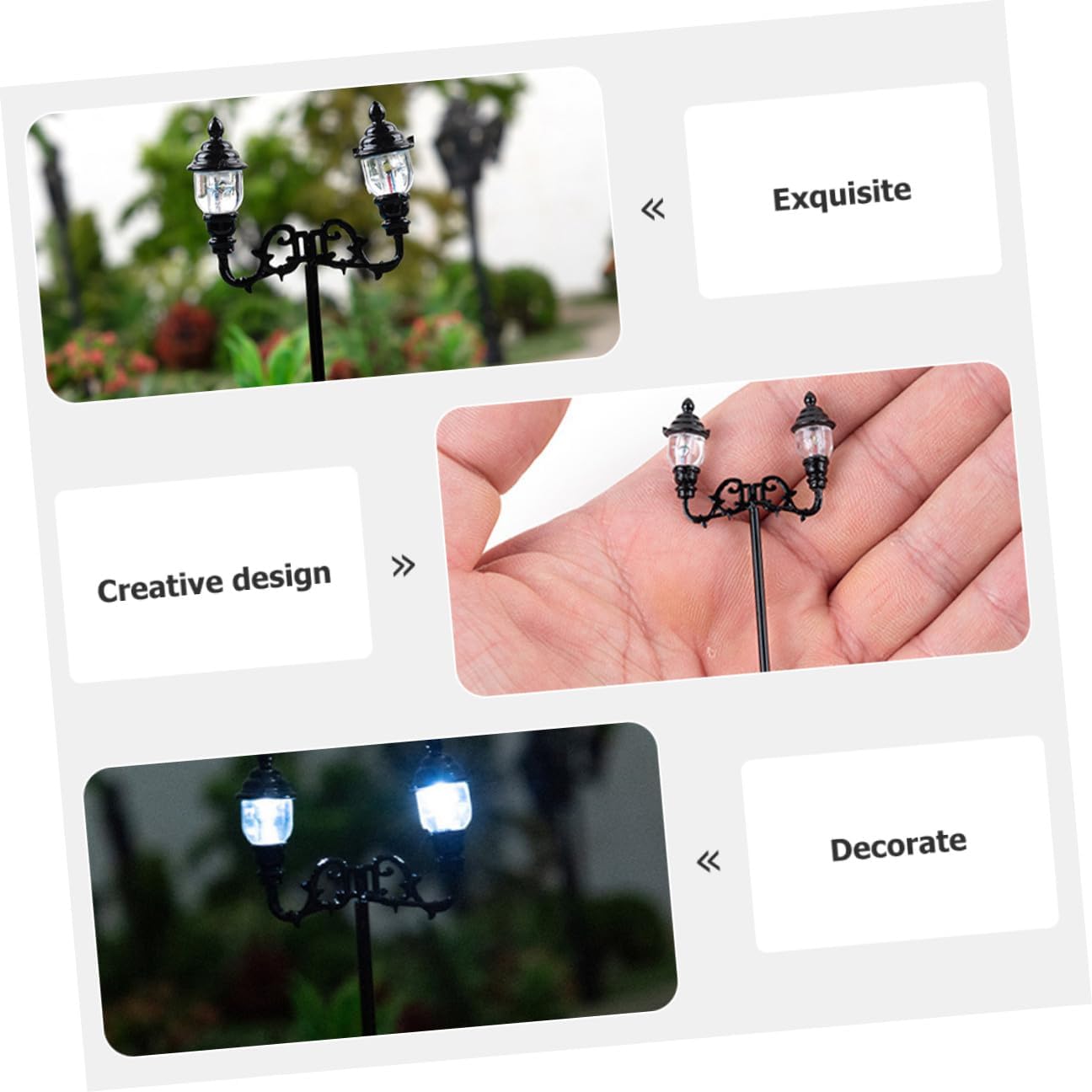 Mini lampada da giardino: caratteristica e dal design realistico, semplice e nel design, linee morbide, decorazione per lampioni stradali Modelli di mini lampioni: adatti per decorazioni di mini case e tavoli di sabbia, ottima decorazione per la tua mini casa, creando scene di vita colorate, miniatura di lampade da parco Lampioni stradali in miniatura: utili per la progettazione e la costruzione di modellini di treni, stazioni ferroviarie, modelli di progetti scolastici, decorazioni per tavoli di sabbia Mini lampada da giardino: gamma di utilizzo multipla, una buona decorazione in miniatura, in particolare per decorazioni paesaggistiche di case in miniatura, modelli di lampioni stradali in miniatura Decorazioni in miniatura: mettile su una casa in miniatura per dettagli più realistici e ottieni un'impressione visiva diversa, accessori per lampioni