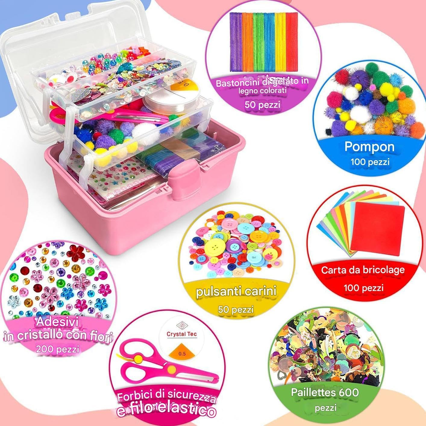 Sviluppo Abilità Artistiche: Stimola la crescita artistica unendo progetti di artigianato pratico a giochi educativi che rafforzano il riconoscimento dei colori, affinano le abilità motorie fini e nutrono efficacemente il senso estetico del bambino attraverso un apprendimento coinvolgente e naturale Protezione per la Crescita Sana: Ideato per allinearsi a rigorose norme di sicurezza, questa collezione di arte e artigianato garantisce serenità ai genitori utilizzando materiali innocui che salvaguardano la salute dei giovani utenti mentre esplorano artisticamente in sicurezza Ripostiglio versatile: Mantiene l'ambiente ordinato grazie alle opzioni di piegatura flessibili, studiato per organizzare efficientemente piccoli articoli di arte e artigianato in molteplici contesti Organizzazione Semplice: La scatola con maniglia massimizza l'efficienza spaziale e offre opzioni di trasporto pratiche, supportando naturalmente lo sviluppo di solide abitudini organizzative nei bambini Possibilità di Creazione Estese: Differenti approcci al gioco creativo stimolano la fantasia infantile e soddisfano le necessità manuali con un'ampia varietà di materiali artistici, garantendo apprendimento e divertimento senza limiti