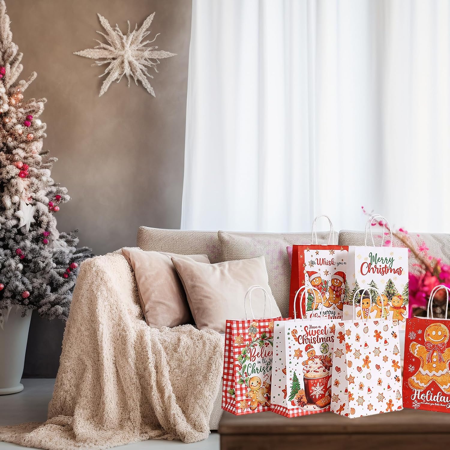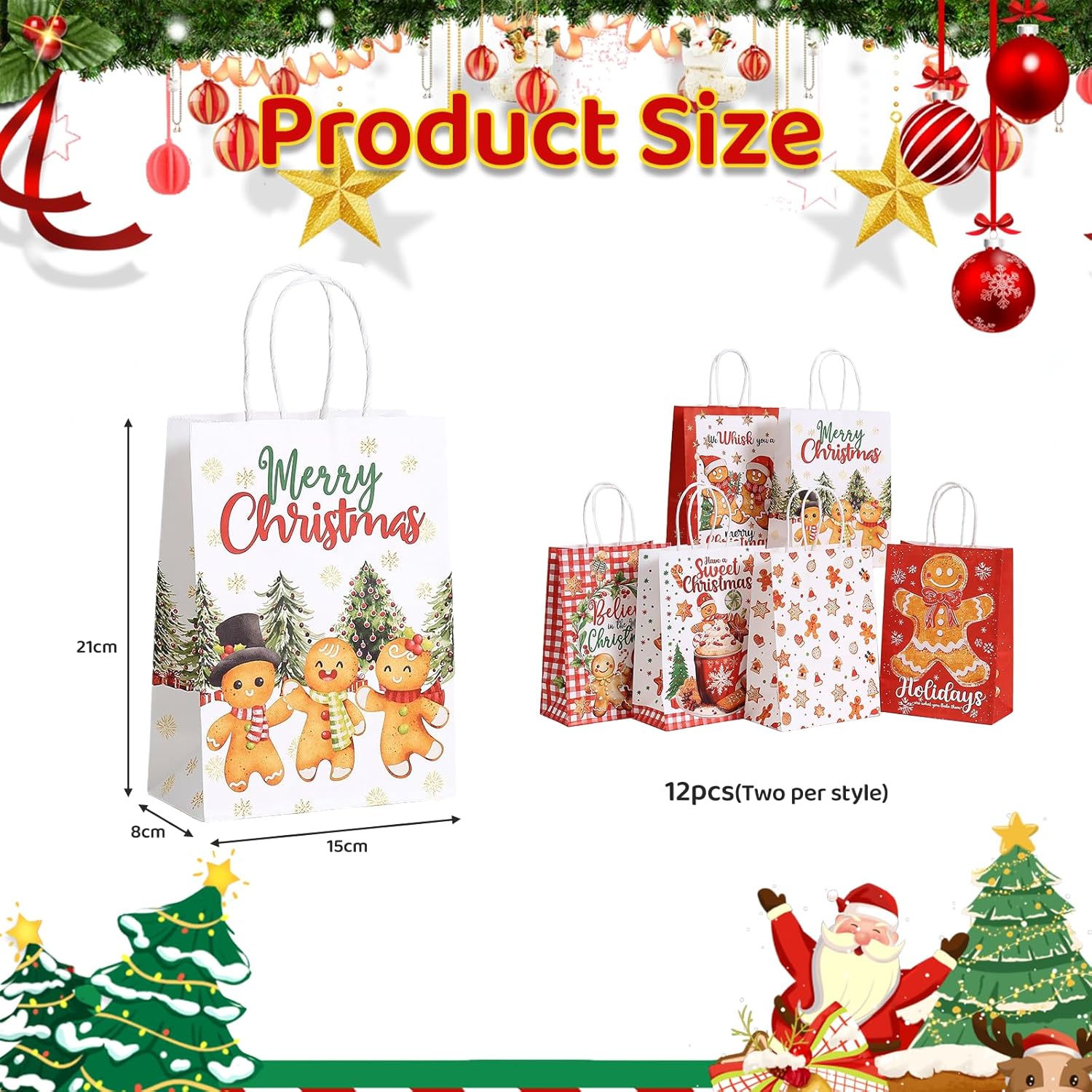 Materiale: questa confezione natalizia è realizzata in carta kraft di alta qualità, robusta e durevole e offre un'eccellente capacità di carico. Il motivo natalizio della carta crea un'atmosfera festosa. È ecologico, durevole e soddisfa i moderni requisiti estetici e pratici. Funzione: questa borsa natalizia riempitiva è ideale da regalare e presenta un'ampia apertura per un facile inserimento e una robusta maniglia in corda di canapa per un comodo trasporto. Ciò rende facile e festoso confezionare e regalare regali di Natale. Descrizione del prodotto: Questo piccolo sacchetto natalizio contiene 12 sacchetti di carta singoli con 6 diversi motivi sul tema degli omini di pan di zenzero natalizi. I disegni sono caldi e amorevoli, irradiano un'atmosfera festosa e trasmettono il classico spirito natalizio e dolci auguri. Vantaggi: questo sacchetto di sacchetti per feste non solo ha un bell'aspetto e valorizza immediatamente il tuo regalo, ma offre anche molto spazio all'interno per regali di diverse dimensioni. Non è richiesto alcun imballaggio esterno, il che fa risparmiare tempo e lo rende un'opzione regalo ideale per i festival. Applicazioni utilizzabili: questo sacchetto di carta medio è perfetto per le feste di Natale, lo scambio di regali tra amici o le riunioni di famiglia. Questa borsa è adatta anche alla vendita al dettaglio e ai piccoli mercatini artigianali, rendendola adatta a molte occasioni che richiedono un'atmosfera festosa.