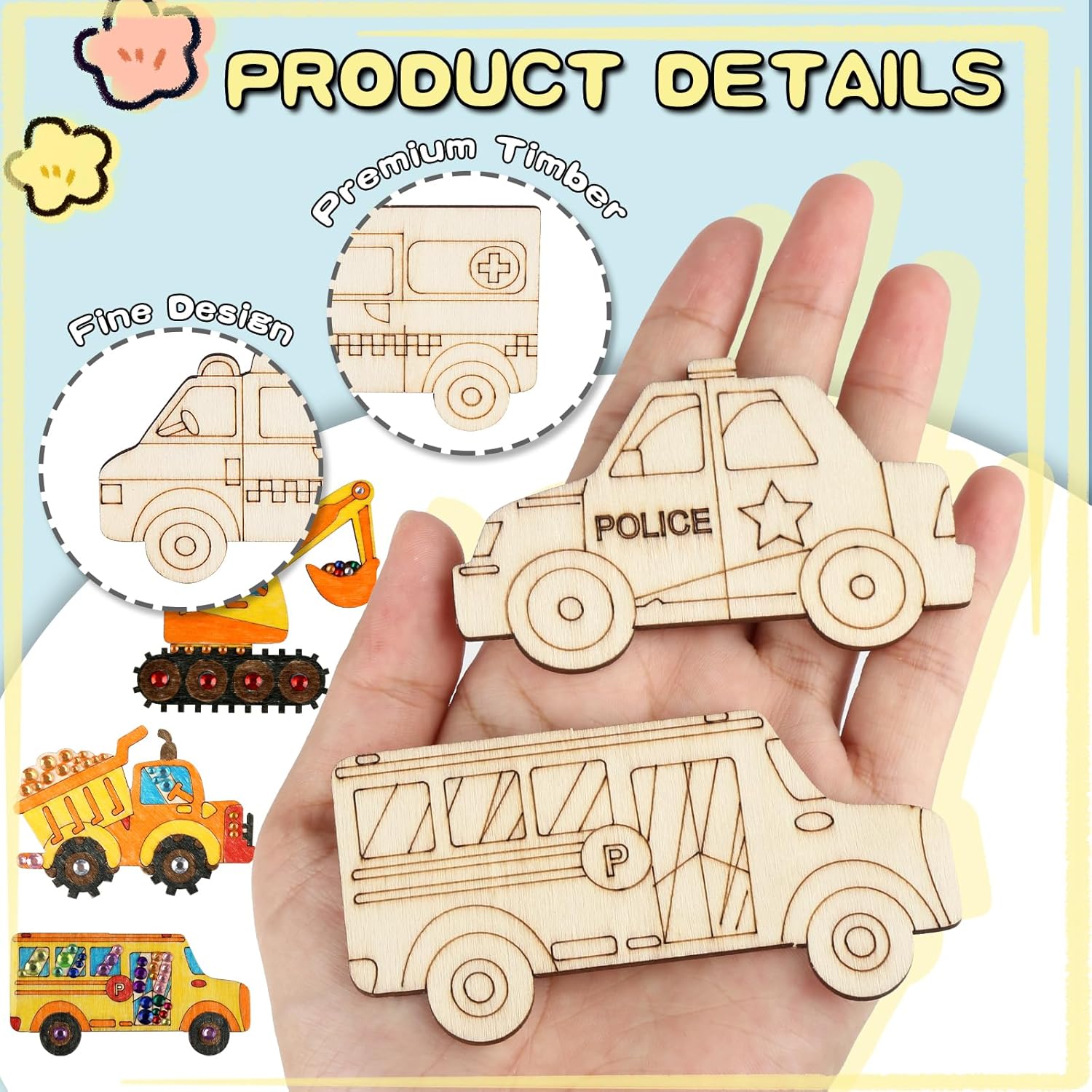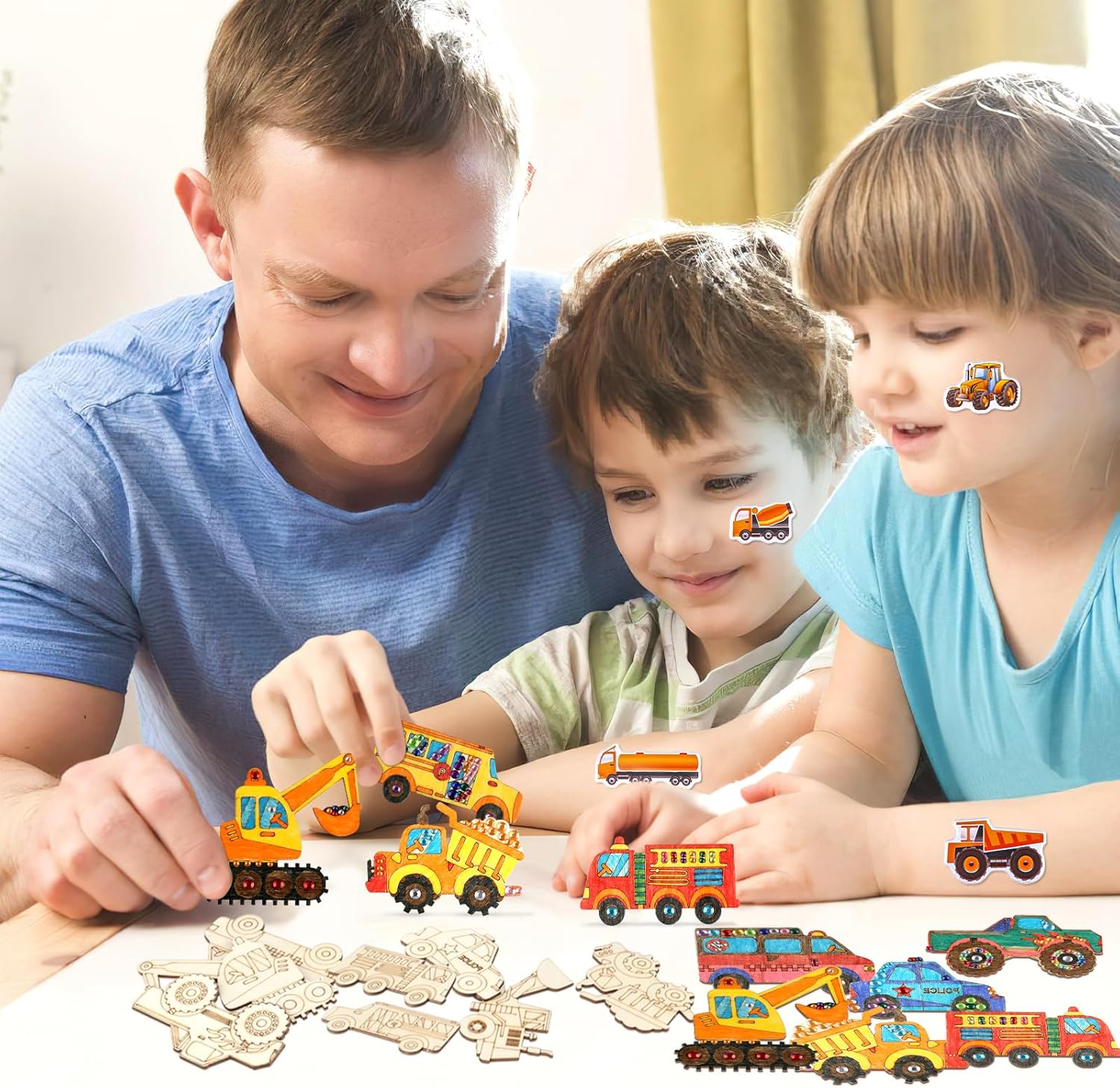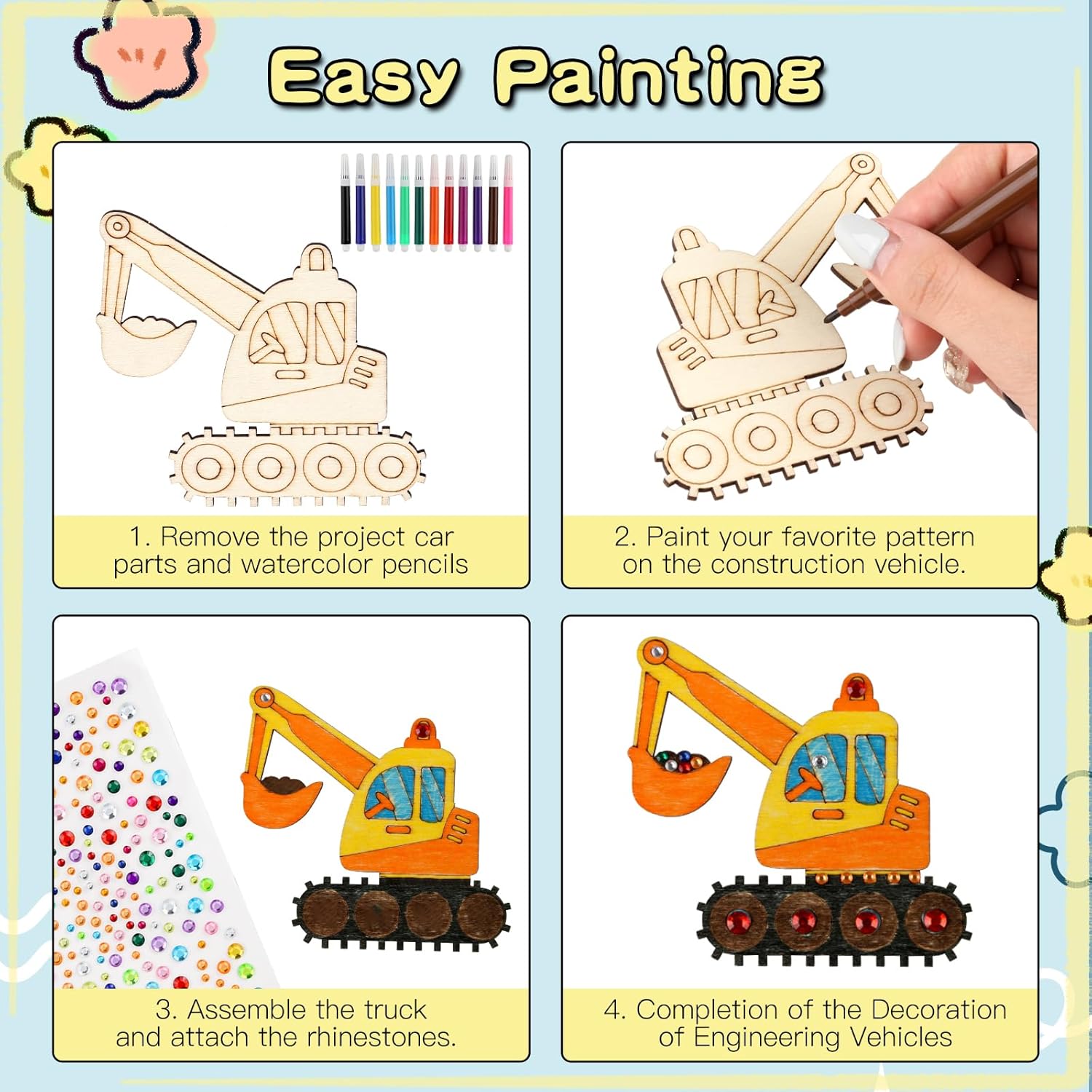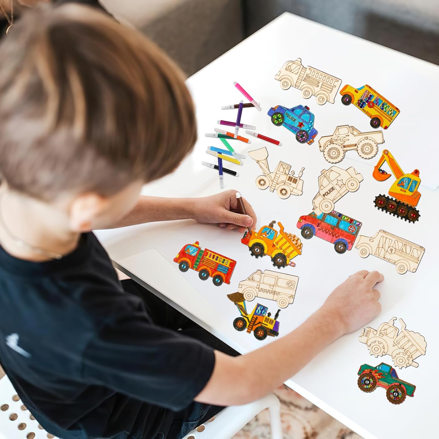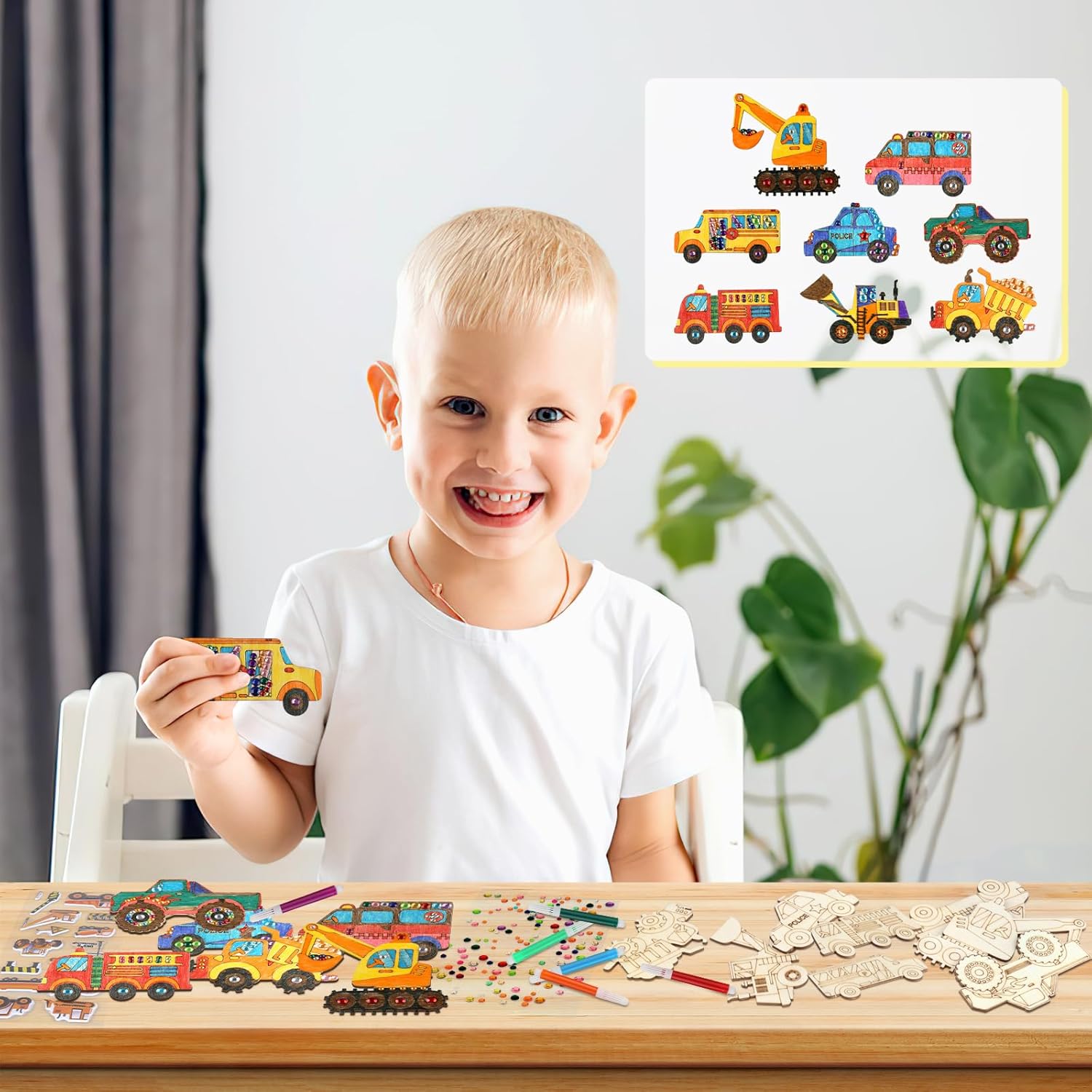 Contenuto del set: riceverete 24 pezzi di kit fai da te per auto per bambini in 8 stili, 3 pezzi per ogni stile, 12 pennelli da pittura, 1 adesivo con strass, 1 adesivo per auto. Stili ricchi e quantità sufficiente, comodo da usare o sostituire, abbastanza per soddisfare le tue esigenze quotidiane. Legno di alta qualità: i bambini fai da te sono realizzati con assi di legno di alta qualità con bordi lisci, che migliorano la sicurezza d'uso, in modo da non doversi preoccupare di danni alla pelle o graffi alle mani. L'eccellente stabilità e durata lo rendono non facile da rompere o deformare, in modo da poter godere della bellezza e della praticità di questa decorazione per lungo tempo. Simpatici motivi per auto: questo ornamento in legno ha bellissimi motivi per auto, tra cui escavatori, furgoni, ambulanze, autobus, auto della polizia, trattori, bulldozer e altri modelli diversi, i suoi colori vivaci e le belle forme mostrano il fascino delle auto. Elegante e vivace, questo ornamento si adatta perfettamente al tuo arredamento e diventerà il punto forte della tua decorazione domestica. Kit fai da te in legno: questi set fai da te in legno per bambini sono facili da dipingere e macchiare o divertirsi con gli amici. Puoi essere creativo con i marcatori, abbellire i glitter per aggiungere colore e decorare insieme, che non solo allena abilità pratiche, ma stimola anche una ricca immaginazione e creatività. Nel processo, puoi goderti il divertimento della creazione e lasciare ricordi indimenticabili. Ampia applicazione: questi set fai da te per auto in legno per bambini offrono infiniti spazi creativi per gli appassionati di fai da te e possono anche essere facilmente decorati con sottobicchieri, etichette regalo, etichette scritte a mano e insegne, ideali per la decorazione della casa. Queste opere d'arte possono essere facilmente appese a pareti, porte, finestre, armadi, librerie o rami di alberi, riempiendo ogni angolo con il colore e la temperatura della vita.