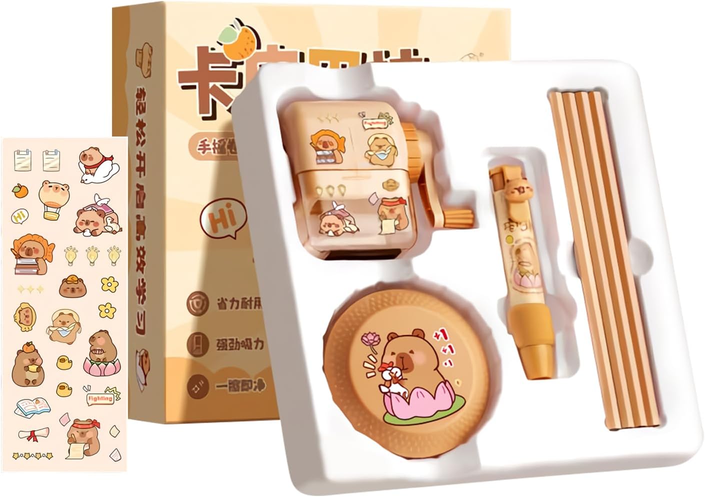 Soluzione Pulizia Multiuso: Combina un efficiente aspirabriciole elettrico per la scrivania, un affidabile temperamatite a manovella e gomme resistenti con impugnatura morbida per un utilizzo quotidiano senza sforzo Esperienza Migliorata: Dotato di aspiratore elettrico e temperamatite, il set migliora l'efficienza di studio mantenendo l'area di lavoro ordinata e garantendo compatibilità con tutti i tipi di matite per una maggiore concentrazione Sicurezza Garantita: Costruzione robusta in PP resiste all'uso frequente mantenendo la qualità nel , affidabilità costante per serenità duratura nell'impiego quotidiano Dettagli Preziosi: Kit cancelleria pensato per bambini e ragazzi, trasmette affetto durante compleanni, feste e Natale grazie a design delizioso e presentazione ricercata che porta gioia Tema Cartone Adorabile: Design accattivanti di capibara e panda un tema divertente che cattura l'attenzione e incoraggia la curiosità nelle attività educative per l'infanzia