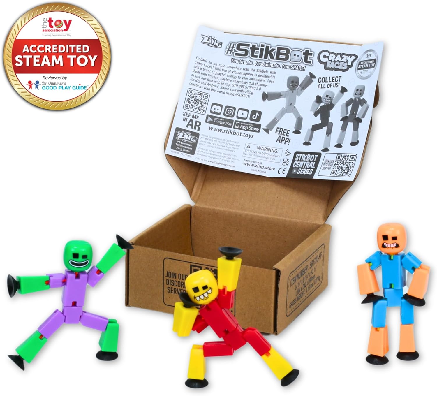Espressioni esilaranti e colori audaci Volti stravaganti + colori vivaci a tinta unita = divertimento infinito! Mettili come preferisci per le risate finali. Stop-Motion reso facile Scarica l'app StikBot Studio GRATUITA, imposta il treppiede incluso e inizia a filmare le tue animazioni! Esclusiva confezione da 3 disponibili solo qui! Questi unici StikBots sono perfetti per collezionisti e creatori. Il pluripremiato giocattolo STEAM Aumenta la creatività divertendoti, riconosciuto dalla Good Play Guide del Dr. Gummer! 🌟 Unisciti a una community globale Condividi le tue creazioni con #StikBot ed esplora i contenuti e gli spettacoli dei fan su StikBot Central YouTube.