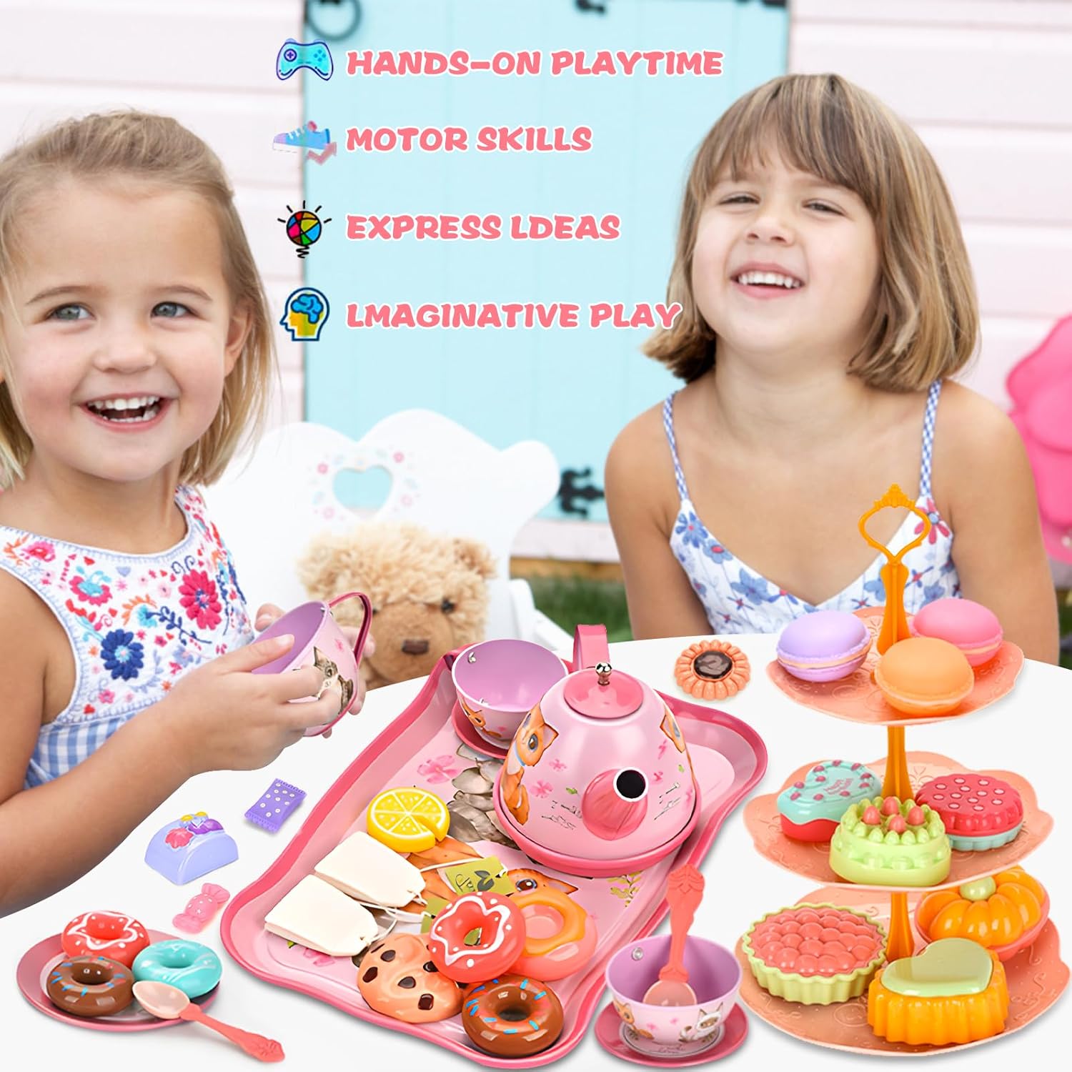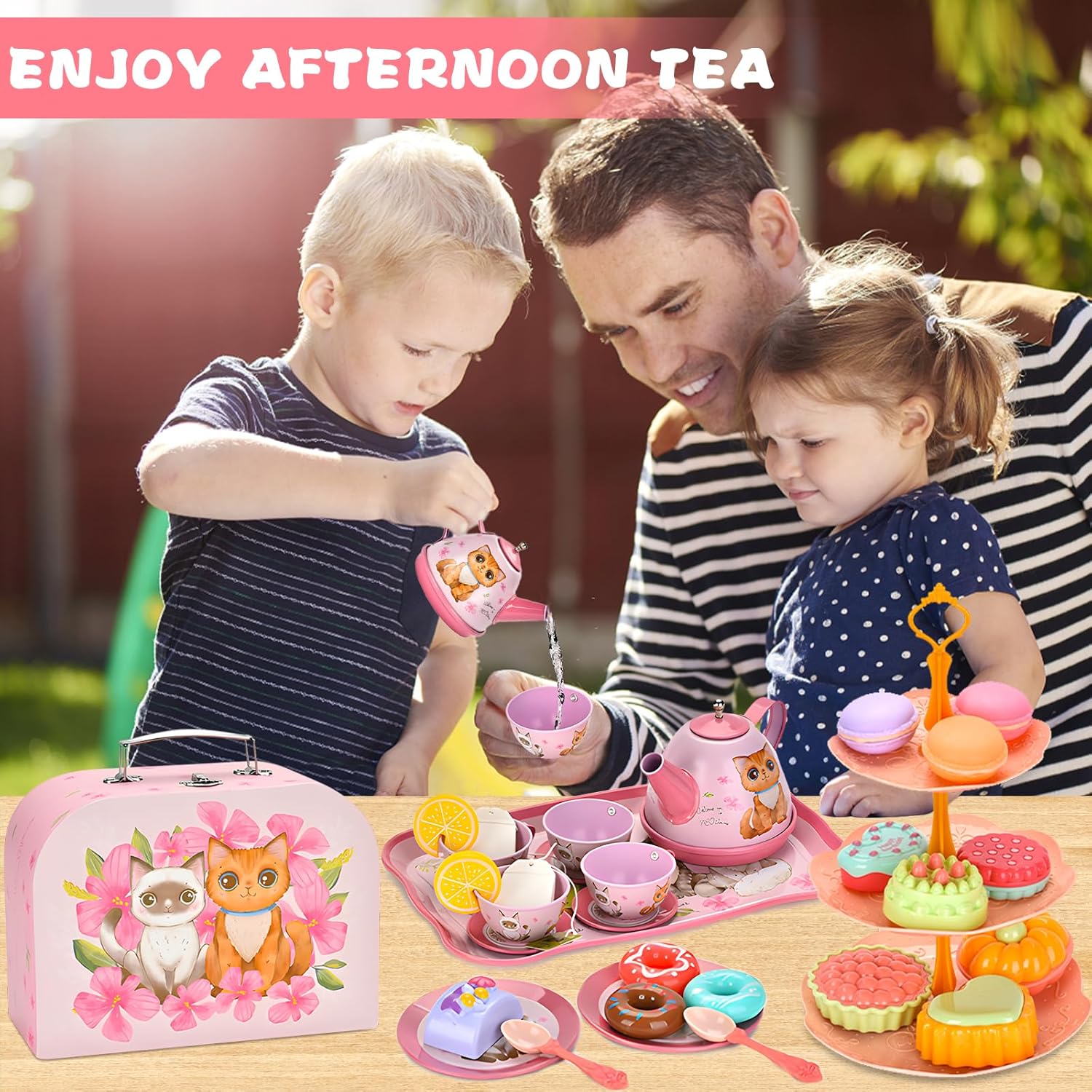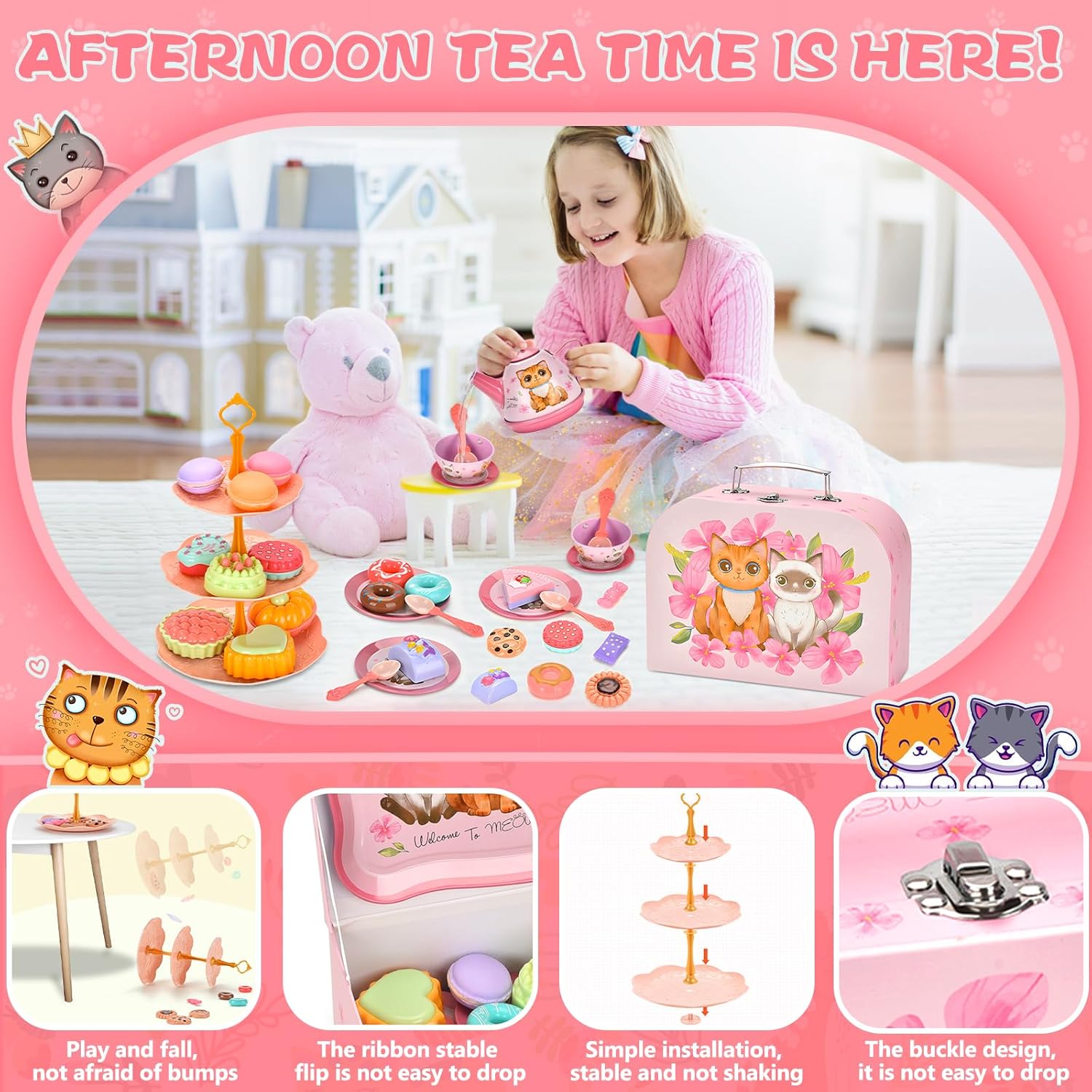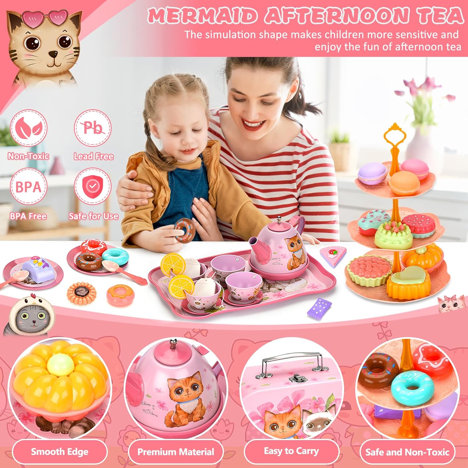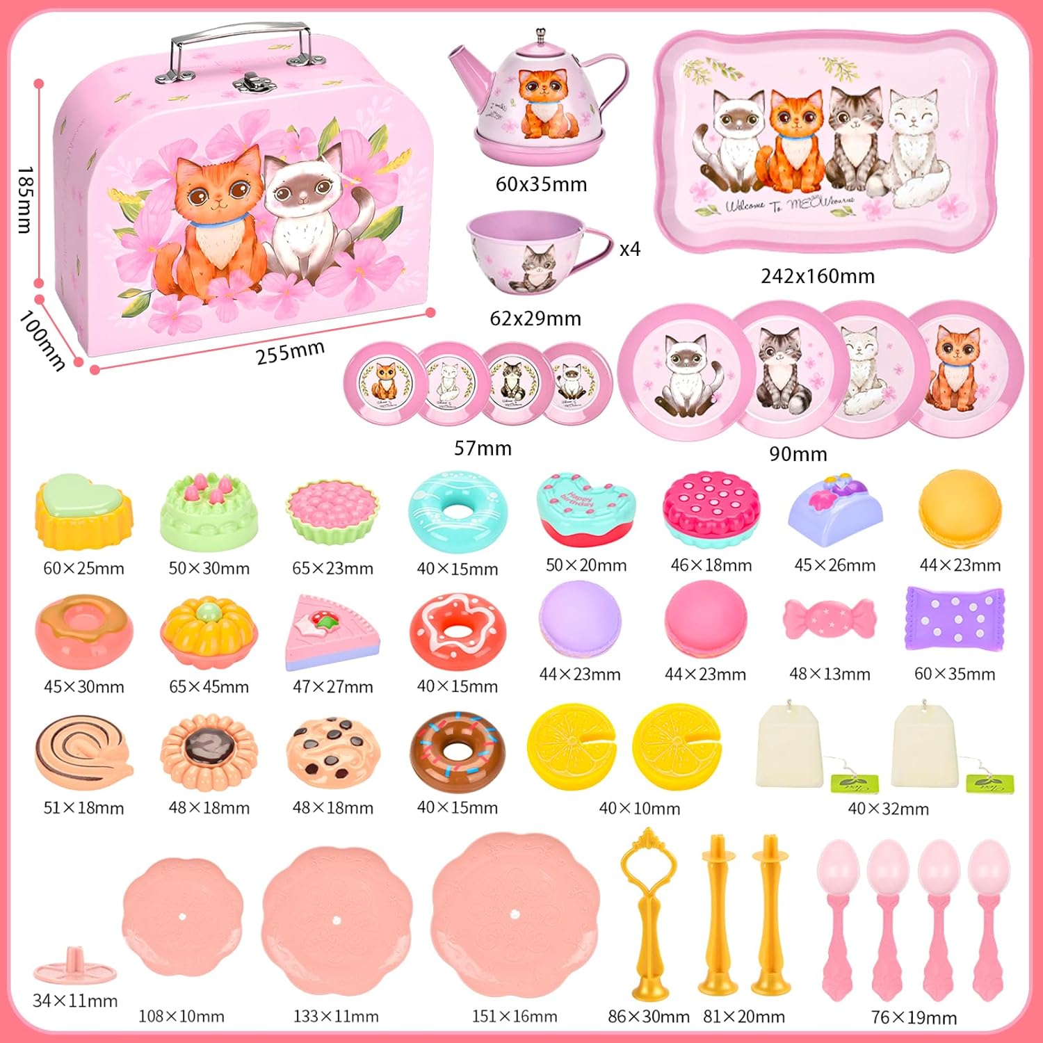 Set da tè lussuoso da 50 pezzi per bambini: 1 teiera in stagno, 4 tazze da tè in stagno, 4 sottobicchieri in stagno, 4 piatti in stagno, 4 cucchiai, 1 vassoio da dessert a 3 piani, 1 vassoio da dessert, 2 bustine di tè, 2 fette di limone, 2 caramelle, 4 * Ciambelle, 8 torta, 3 biscotti, 3 biscotti macaron, 1 borsa in cartone. MATERIALE SICURO: il nostro servizio da tè per gattini per bambini è realizzato in materiale di lamiera stagnata sicuro e gli altri sono realizzati in materiale plastico atossico e innocuo, che può essere facilmente pulito con un panno o acqua pulita. Tutte le parti sono durevoli e possono essere riciclate e giocate. Giocattolo portatile per feste da tè: viene fornito in una scatola di cartone rosa con manico per il trasporto, leggero e facile da riporre. Così i tuoi bambini possono portarlo ovunque e giocare allegramente con i loro amici quando tengono in mano questa fantastica valigetta da tè. CUCINA DA GIOCO PER BAMBINI: questo simpatico giocattolo per il tè pomeridiano è stato appositamente progettato per i giochi di simulazione per stimolare l'immaginazione dei più piccoli e migliorare la loro creatività, abilità sociali e coordinazione pratica, indipendenza e fiducia in se stessi. Super regalo per le ragazze: ogni bambina è totalmente impegnata in cosplay e questo set per tea party è fatto appositamente per lei. Perfetto come regalo di compleanno. Perfetto come regalo di compleanno, per vestire o per feste di animali domestici e altri oggetti a tema gattino.
