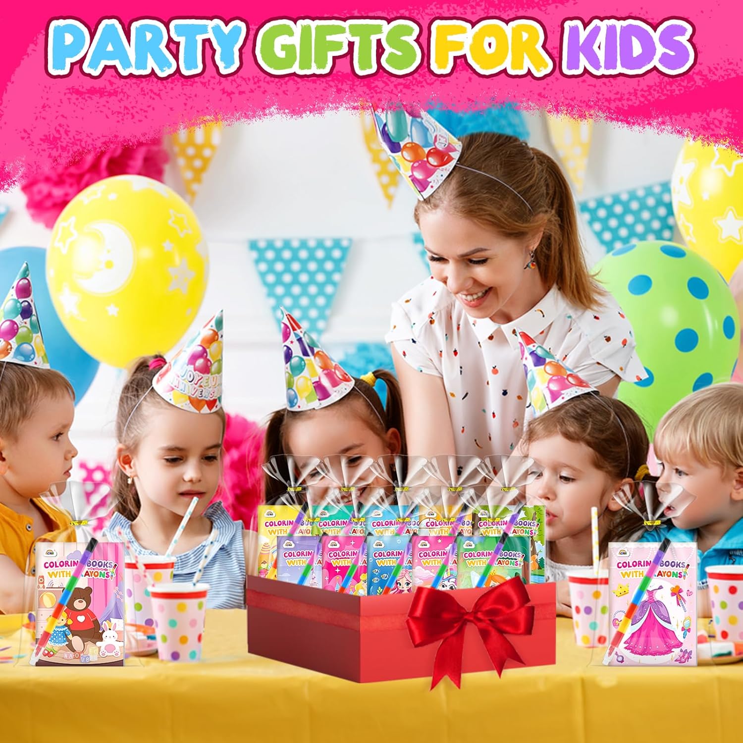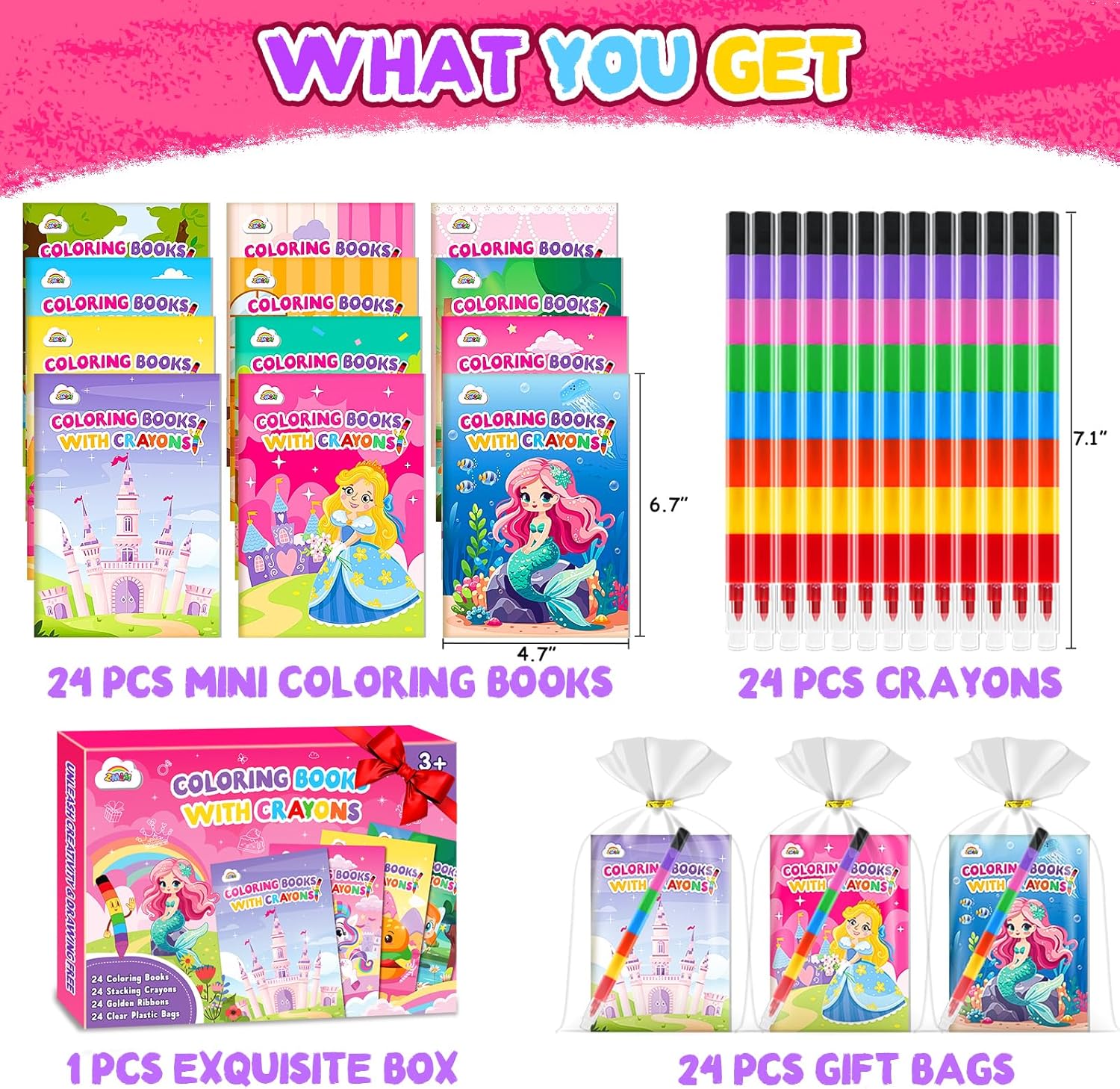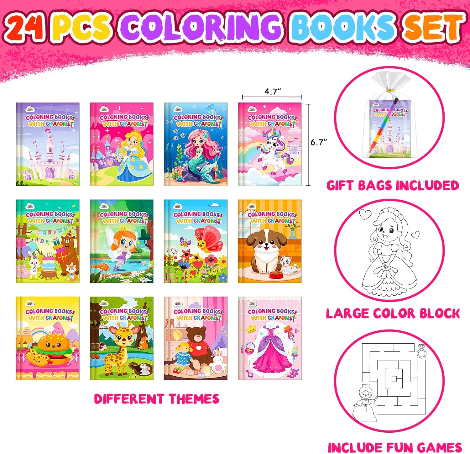 【24 libri da colorare con pastelli】Il nostro set di mini libri da colorare include 24 confezioni di mini libri da colorare (ogni libro misura 6,7 x 4,7 pollici) in 12 stili, 24 confezioni di pastelli impilabili (ognuno misura 7 pollici) in 8 colori e copertina protettiva inclusa, 26 sacchetti regalo e 26 nastri dorati in una scatola. Regalabile e granderegalini fine festa compleanno bambini, borsa festa per i bambini e premi in classe per gli studenti. 【12 Temi Diversi Gadget Compleanno】Abbiamo 12 temi (2 libri per tema):animali, sport, frutta e verdura, dessert, oceano, trasporti, dinosauri, spazio, unicorni, principesse, natura, vacanze. Inoltre, abbiamo fornito divertenti giochi di labirinto per ogni libro per un maggiore divertimento, in modo che il set di libri di attività da colorare sia un ottimo punto di partenza per il tuo piccolo artista e un grande regalo per i bambini in età prescolare. 【Pastelli a 8 colori 24 pezzi】Il nostro set di pastelli per bambini è stato progettato con 8 diversi colori vivaci, che aiutano i bambini a creare e disegnare liberamente i loro temi, soddisfacendo perfettamente le esigenze di diversità di colore di bambini e bambine. I colori vivaci aiutano ad attirare l'interesse dei bambini e a ispirare rapidamente la loro creatività, aiutare i vostri bambini ad abbandonarsi alla gioia del disegno e a godere di ore di divertimento creativo. 【Dimensioni portatili da trasportare】I gadget compleanno libri da colorare per bambini misurano circa 12*17cm, dimensioni portatili per le piccole mani dei bambini, facili da aprire e chiudere, leggeri e facili da portare all'aperto, alla festa di compleanno, a scuola, in viaggio, al picnic e al gioco con gli amici, o alla vacanza in famiglia e disegnare con i tuoi bambini per godere del divertimento creativo, non importa dove siano. 【Regali per bambini】Il nostro set di libri da colorare per bambini sacchettini compleanno bambini che lo rende il miglior regalo d'arte per gadget compleanno bambina, perfetto e regalabile per i bambini di età 3-12. Regalo ideale per regalini fine festa compleanno bambini ,Pasqua,Halloween,Natale,,calze ripiene, sacchetti regalo,attività di gruppo, viaggi, attività in classe per il ritorno a scuola, attività di disegno e pittura fai da te in classe.