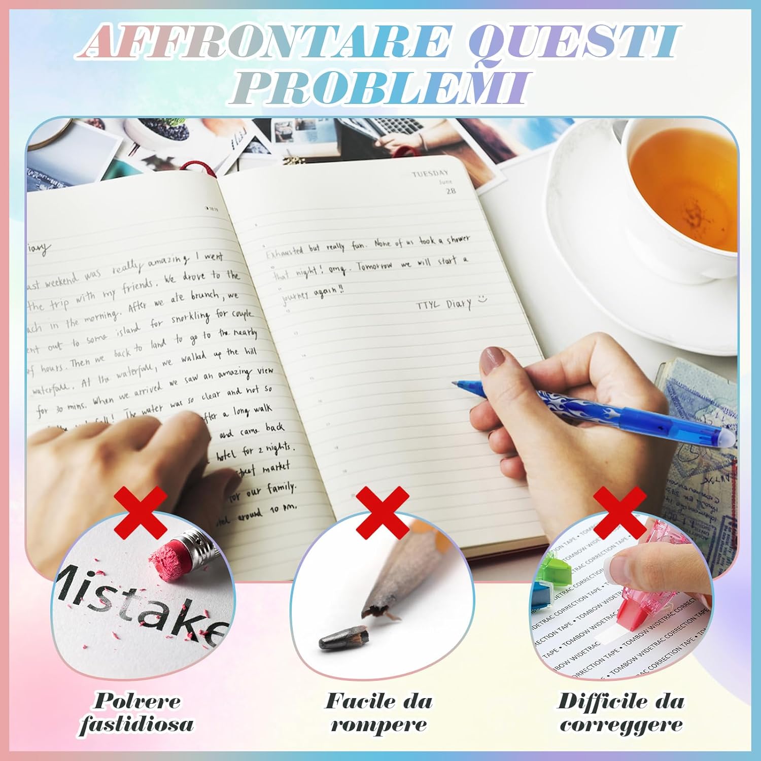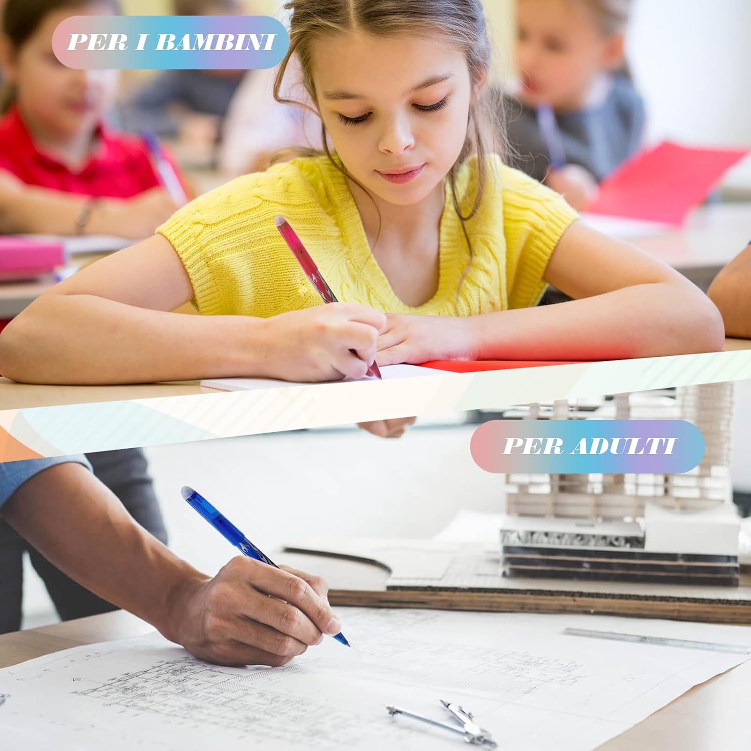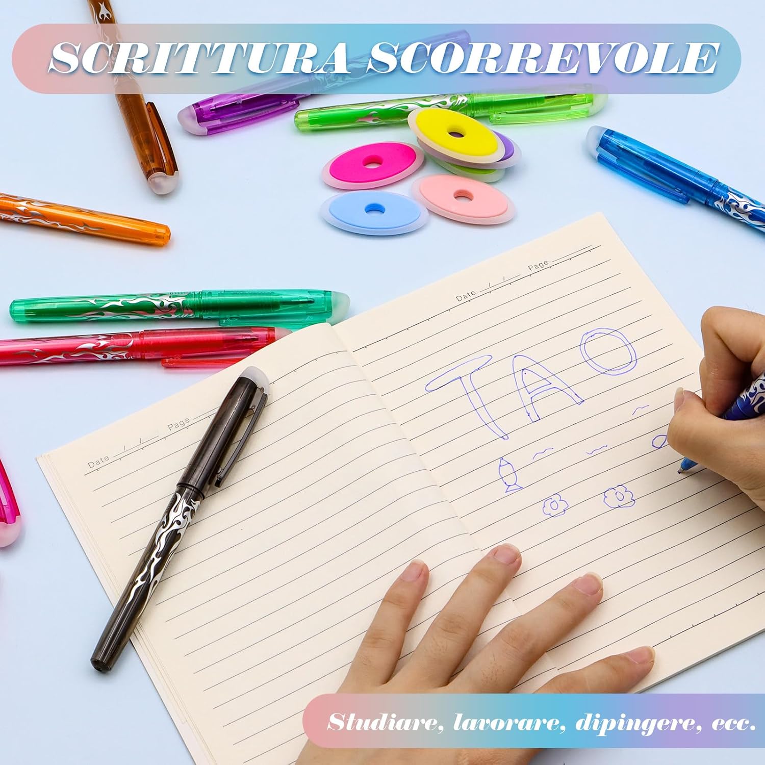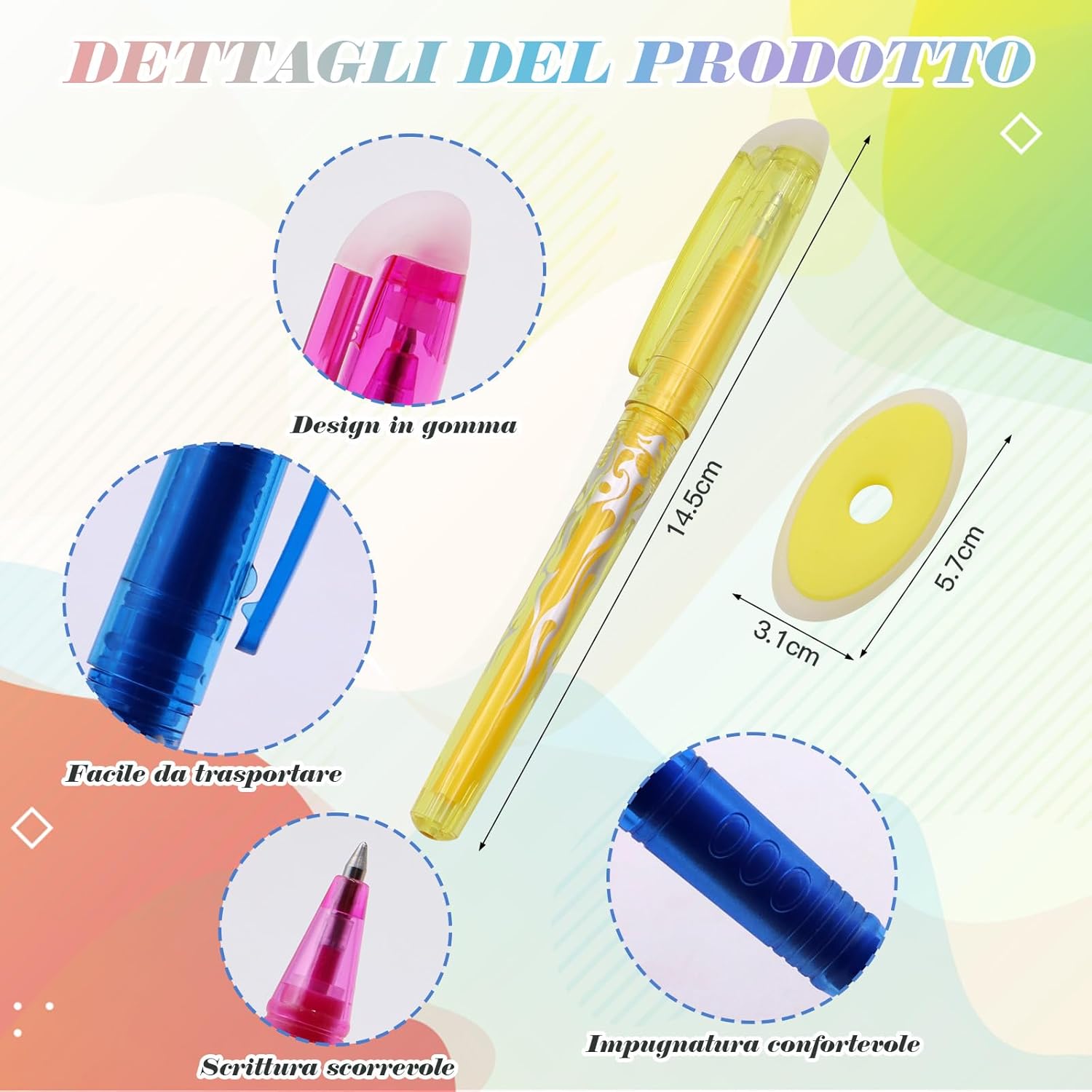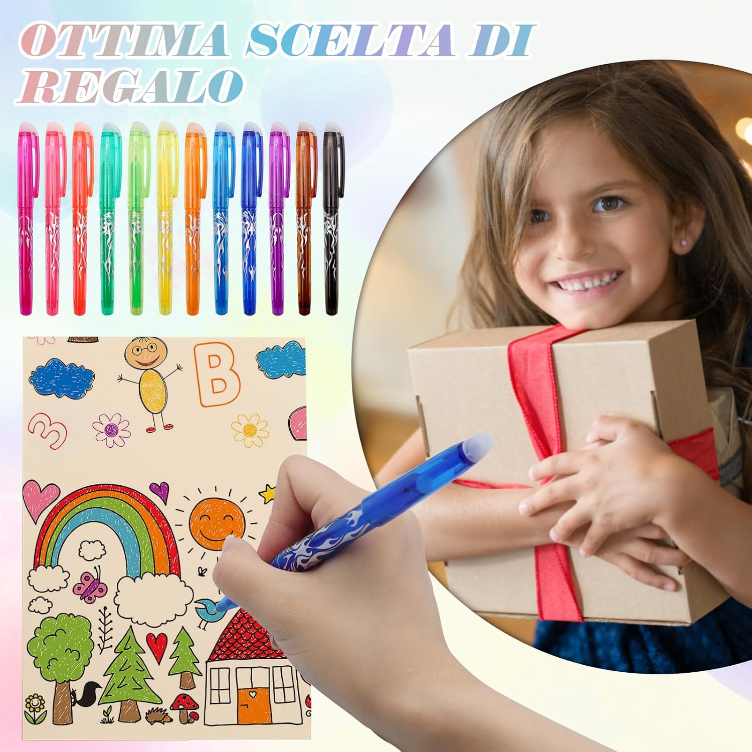 ✏【Penne Cancellabili Colorate】Le nostre penne cancellabili includono 12 penne gel roller cancellabili in diversi colori e 2 gomme, che possono facilmente cancellare errori di scrittura, la quantità è sufficiente per soddisfare le tue esigenze di scrittura o disegno. ✏【MATERIALE DI ALTA QUALITÀ】La penna cancellabile è realizzata con inchiostro ecologico di alta qualità, atossico e inodore, può essere utilizzata con sicurezza sia da adulti che da bambini e ha una punta ultra fine da 0,5 mm per una scrittura fluida. ✏【Funzione cancellabile】 La penne gel cancellabili viene fornita con una gomma sulla parte superiore del cappuccio della penna, inoltre abbiamo altre due gomme. Eventuali piccoli errori di scrittura potranno essere facilmente cancellati senza lasciare residui di scrittura o strappi sulla carta e senza danneggiare le mani o la carta. (Non consigliato per l'uso su documenti di prova, documenti legali o ufficiali.) ✏【Mantenere Pulito】La penna cancellabile è facile da tenere in mano e dispone di un cappuccio dopo la scrittura per evitare che l'inchiostro penetri accidentalmente su vestiti o carta. La penna a sfera cancellabile non lascia residui ed è meno probabile che si macchi le mani, mantenendo la scrittura pulita. ✏【Regalo Pratico】Utilizzare per disegnare, prendere appunti, compiti a casa, firme, diari, materiale scolastico, materiale per ufficio e può anche essere usato come regalo per Natale, compleanni, Pasqua, Ringraziamento, feste e Capodanno. Popolare tra adulti e bambini. Piccolo e raffinato, elegante e resistente, perfetto per studenti e insegnanti, è anche un regalo perfetto per bambini, amici o studenti, un ottimo regalo per feste per bambini, regali di Pasqua, inizio anno scolastico e Natale.