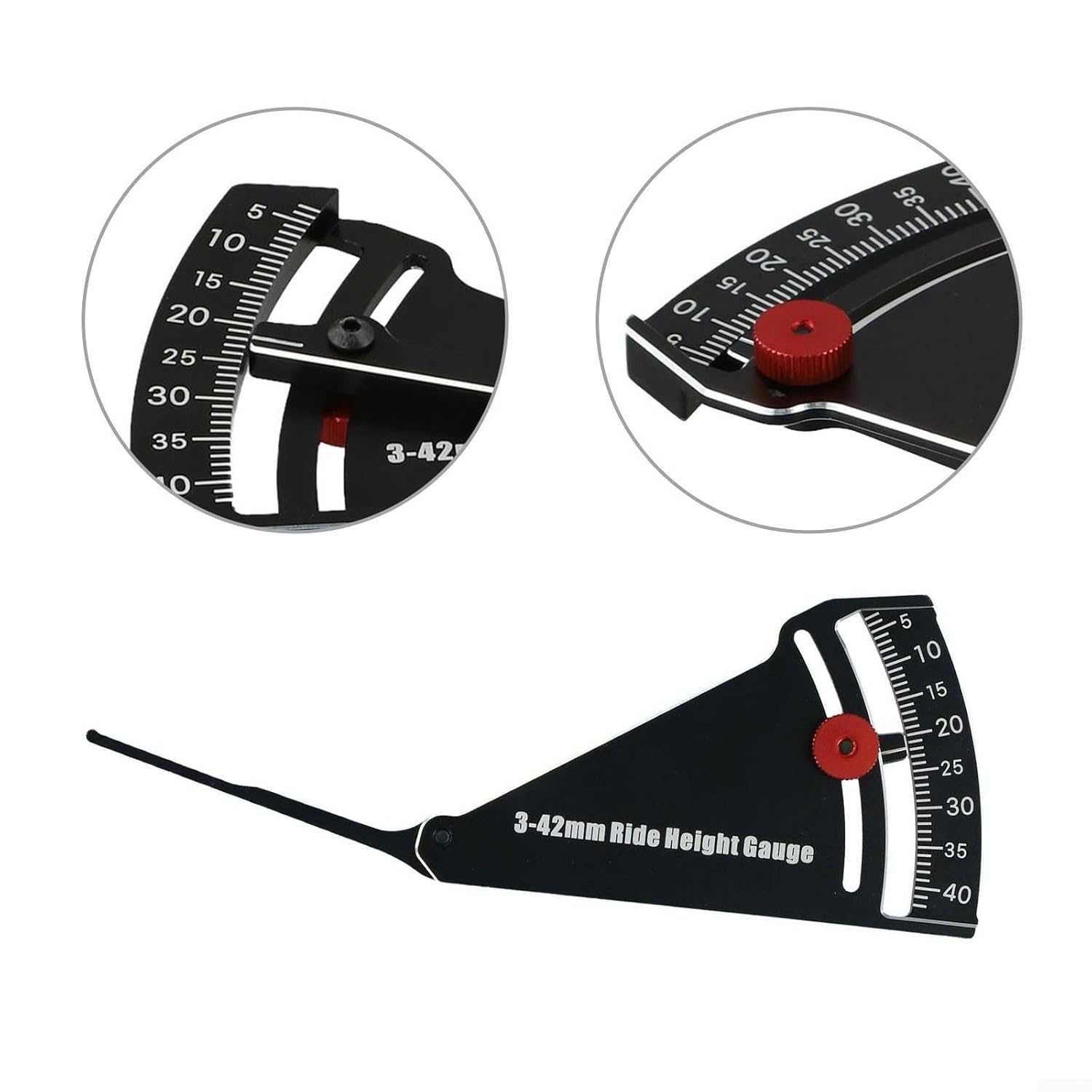 [Misuratore di altezza per auto radiocomandate] Questo misuratore di altezza in alluminio misura da 3 mm a 42 mm, rendendolo adatto a vari veicoli tra cui fuoristrada e modelli di camion. Design robusto in alluminio: realizzato in lega di alluminio con un'elegante finitura nera e segni bianchi trasparenti, questo strumento combina durata con . Efficace funzione anti-allentamento: il pulsante di regolazione include un anello in gomma che impedisce l'allentamento inverso, garantendo misurazioni costanti ogni volta che lo si utilizza. Facile da maneggiare per tutti gli utenti: adatto per hobbisti di tutti i livelli di abilità, questo misuratore di altezza rende la regolazione dell'altezza di guida del tuo veicolo RC semplice ed efficiente. [Promemoria dimensioni] Ricordati di verificare le tue esigenze di misurazione specifiche invece di fare affidamento esclusivamente sulle tabelle delle taglie convenzionali.