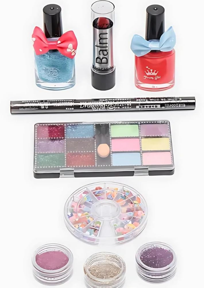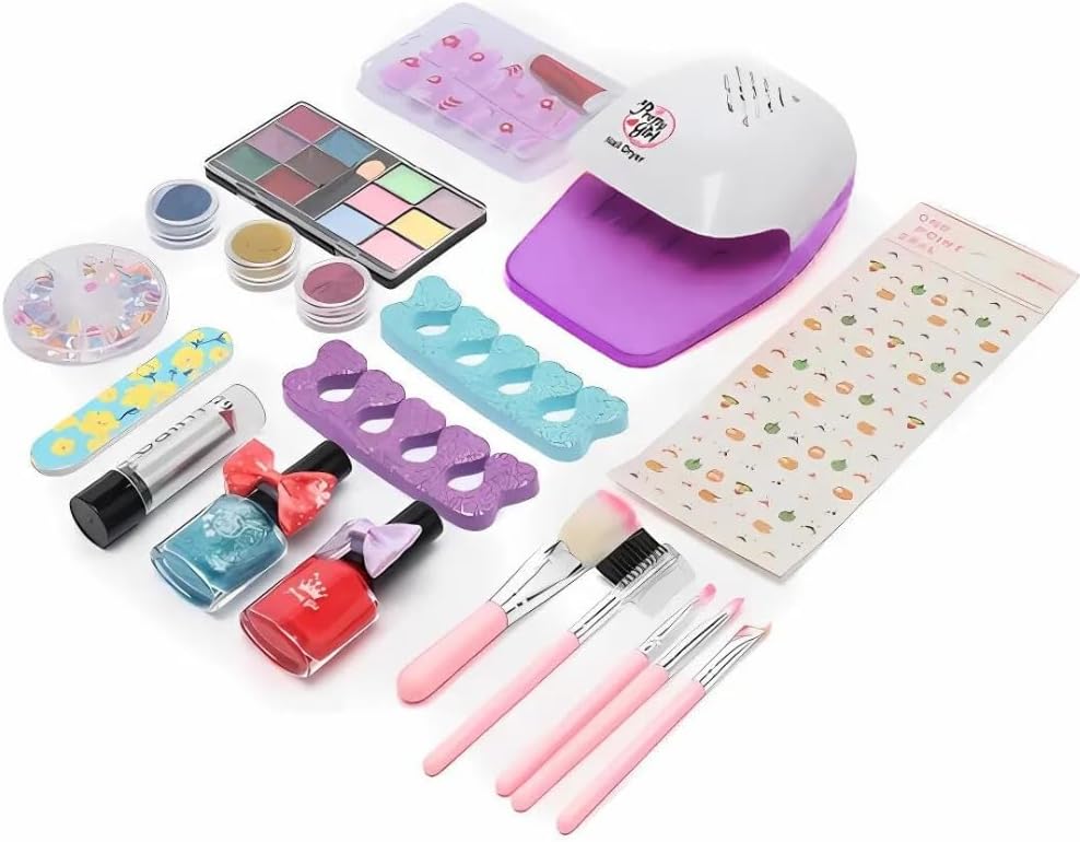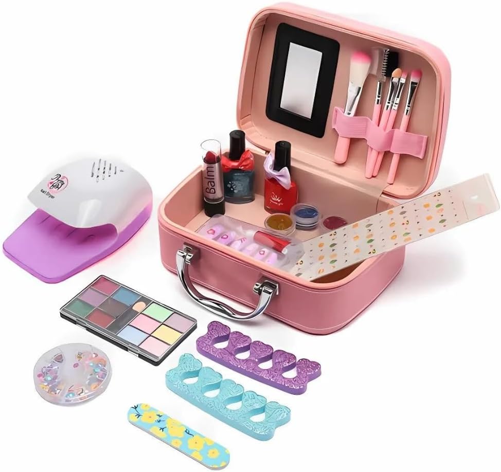 ❤️ Set completo di trucco e unghie per bambini - Questo set contiene 21 pezzi tra cui smalti, rossetto, glitter, adesivi, punte, tavolozze e accessori. Permette alle ragazze di creare i propri stili creativi e ricreare in modo giocoso l'esperienza di un vero salone, incoraggiando l'immaginazione e la creatività. ✅ Asciuga unghie con funzione ventola - L'asciuga unghie integrato soffia delicatamente aria sull'unghia appena dipinta, facendo asciugare lo smalto più velocemente. Alimentato da 2 batterie AA (non incluse), offre divertimento elettrico e sicuro senza una fonte di alimentazione esterna. 👍 Sicuri e delicati sulla pelle - Tutti i cosmetici inclusi sono certificati CE ed EN71, facili da lavare con acqua e delicati sulla pelle dei bambini. Ciò garantisce un gioco sicuro senza rischi di allergie e permette ai genitori di avere tranquillità durante le attività creative. ✔️ Incoraggia la creatività e le abilità - L'uso di smalti, glitter, adesivi e pennelli per il trucco stimola la destrezza manuale, il senso estetico e l'immaginazione del tuo bambino. Le ragazze imparano giocosamente a combinare colori, forme e stile mentre creano i propri disegni. ✨ Valigia pratica e portatile - L'elegante valigia con una pratica maniglia è facile da trasportare e ideale per la casa o in viaggio. Con dimensioni compatte di 20 × 7,5 × 14 cm (chiuso), offre ordine, panoramica e spazio elegante per tutti gli accessori inclusi.