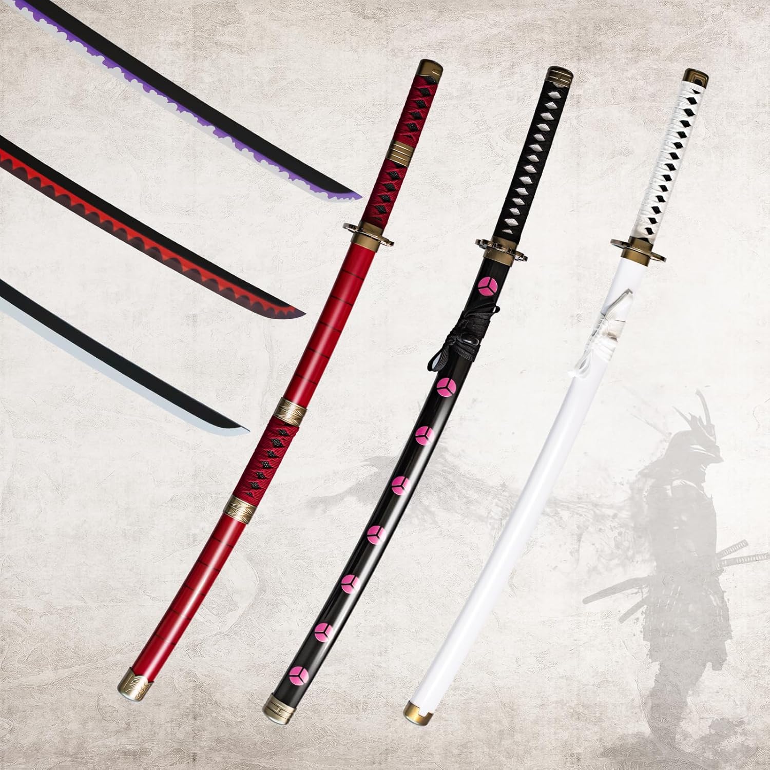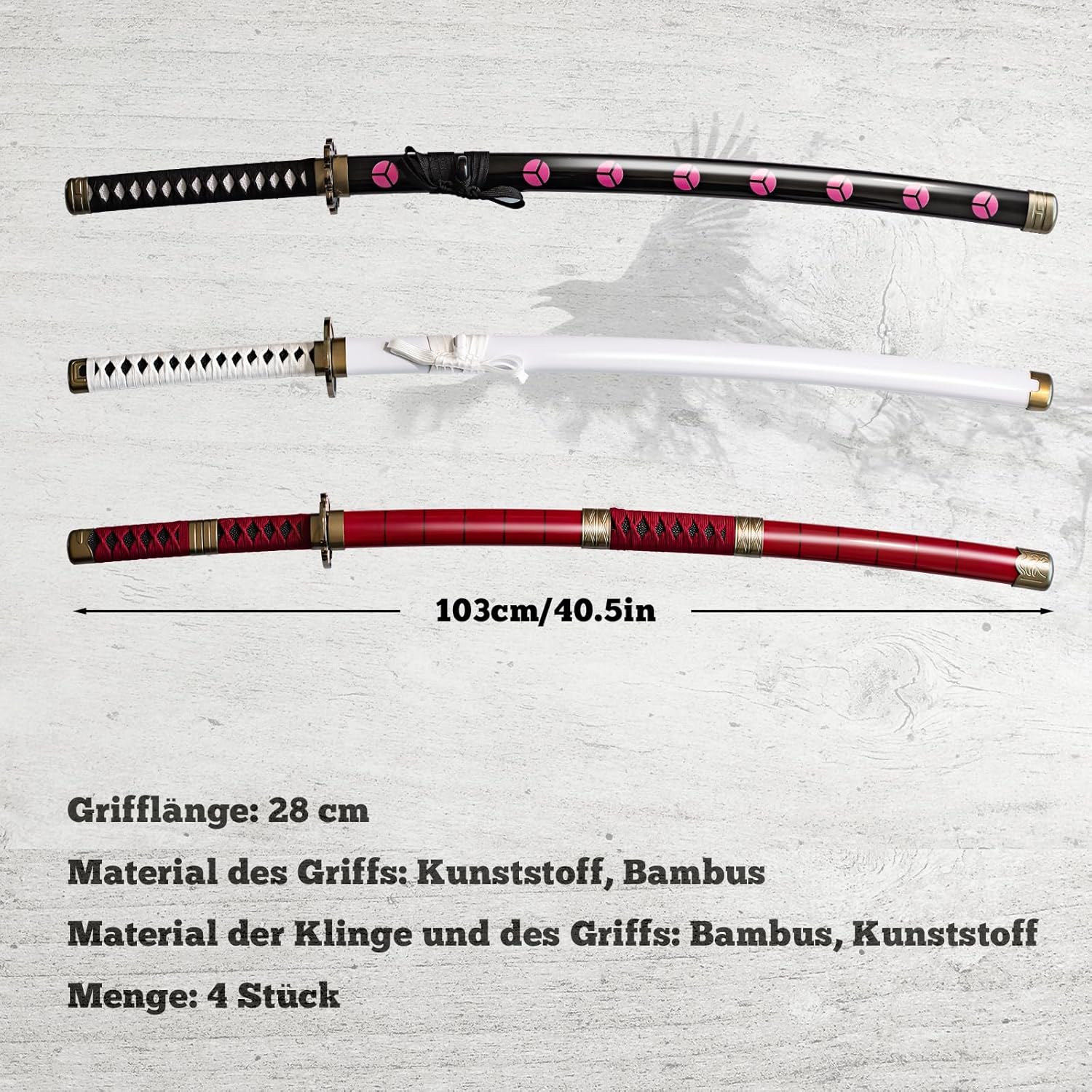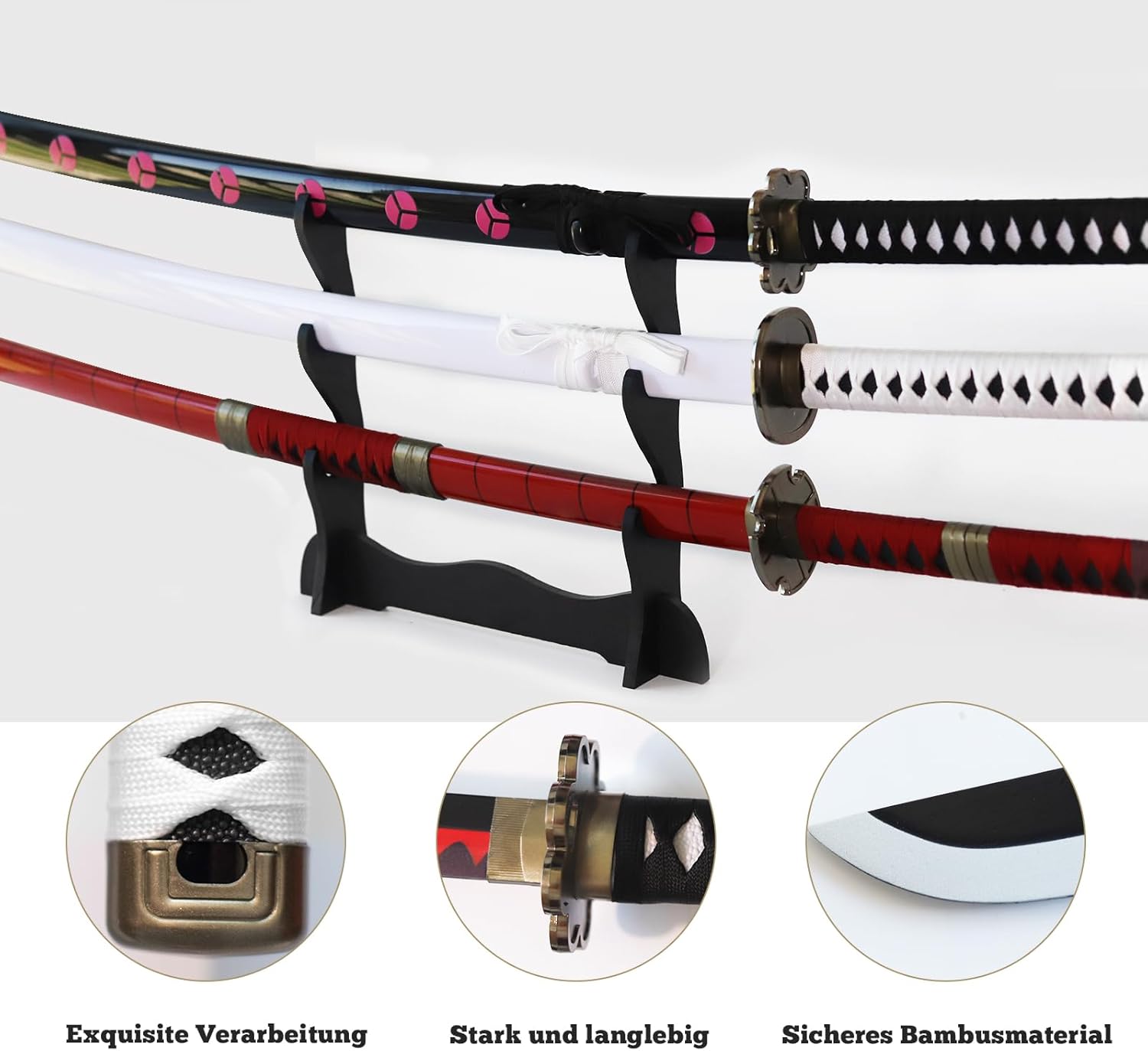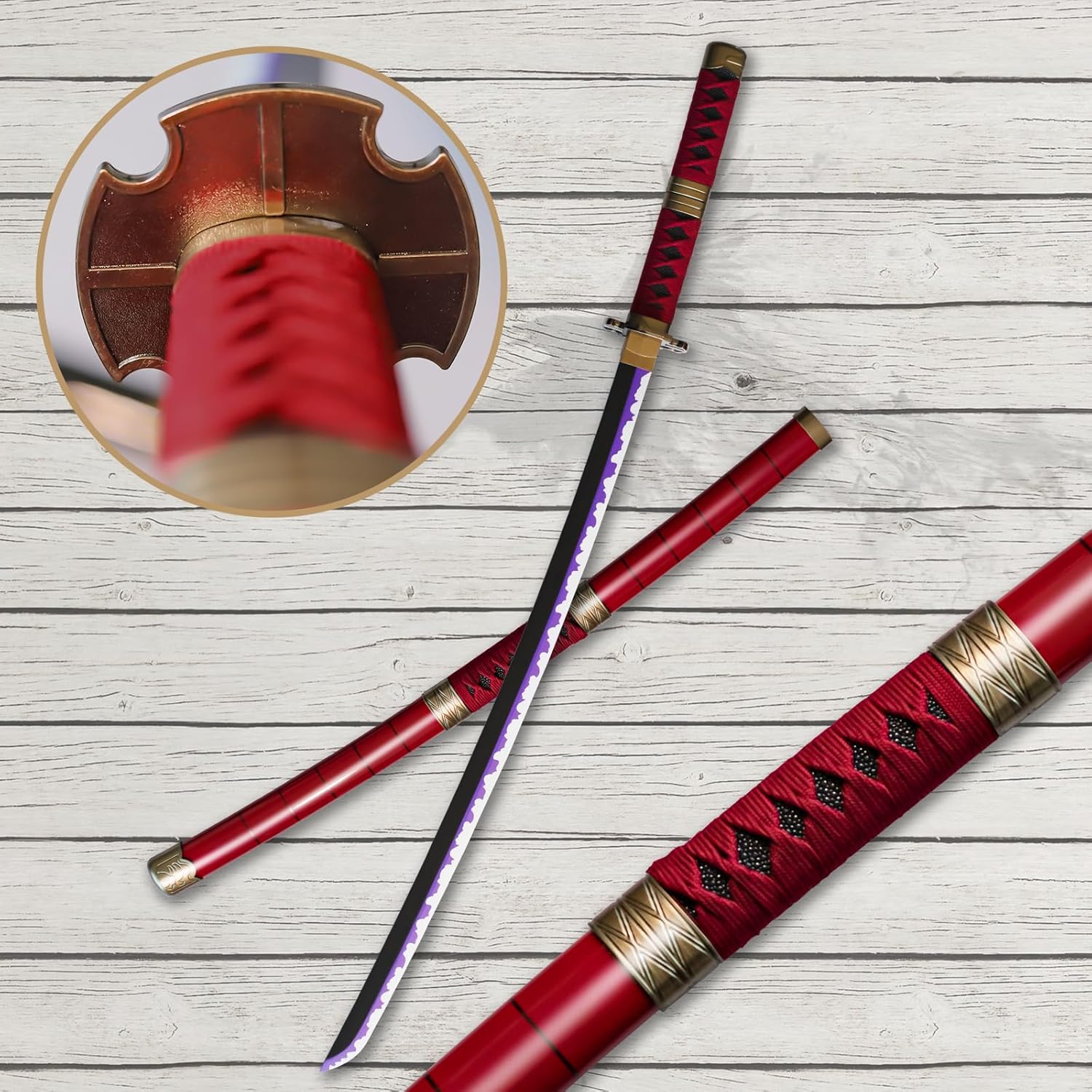 Riproduzione perfetta: questa katana è una riproduzione perfetta dell'anime katana zoro.L'aspetto, la lama e il manico sono tutti realizzati secondo l'originale anime, cercando di ripristinare ogni dettaglio. Materiale di qualità: la spada anime è realizzata in bambù, la tsuba è placcata e il fodero e la protezione per le mani sono realizzati in plastica dura. Il tessuto è realizzato in cotone, che assorbe efficacemente il sudore e previene lo scivolamento. Sicurezza d'uso: la lama della spada anime katana non è affilata, nessuna sbavatura sulla superficie, catana di bambù più leggera del ferro katana e più forte della spada samurai in legno. È un modello di spada samurai sicuro per ogni utente Set Katana: 3 spade Zorro, le spade Katana sono di circa 104 cm di lunghezza e pesa circa 0,5 kg. I katanas di bambù non sono adatti per il taglio di oggetti. Ampiamente utilizzata: la spada in legno Katana può essere utilizzata per cosplay, decorazioni, collezioni, arti marziali ed è anche il miglior regalo per appassionati di anime, collezionisti e cosplayer. È anche un regalo perfetto per appassionati di anime, collezionisti e cosplayer.