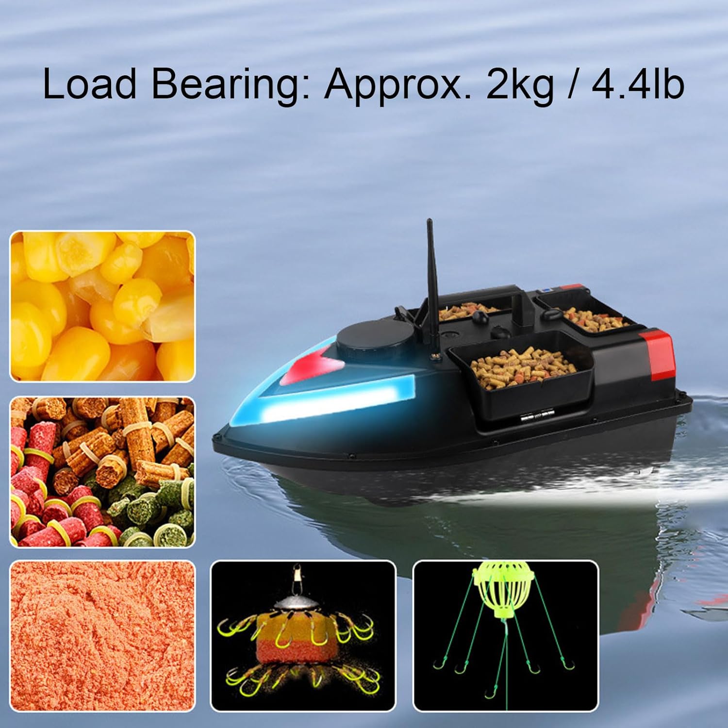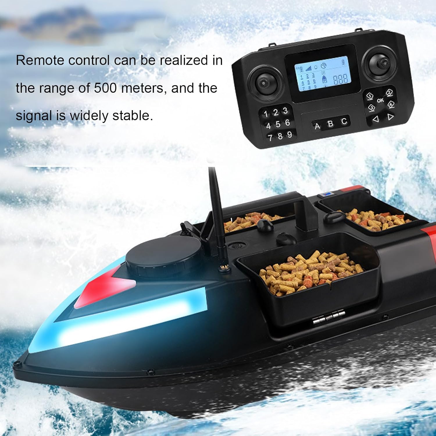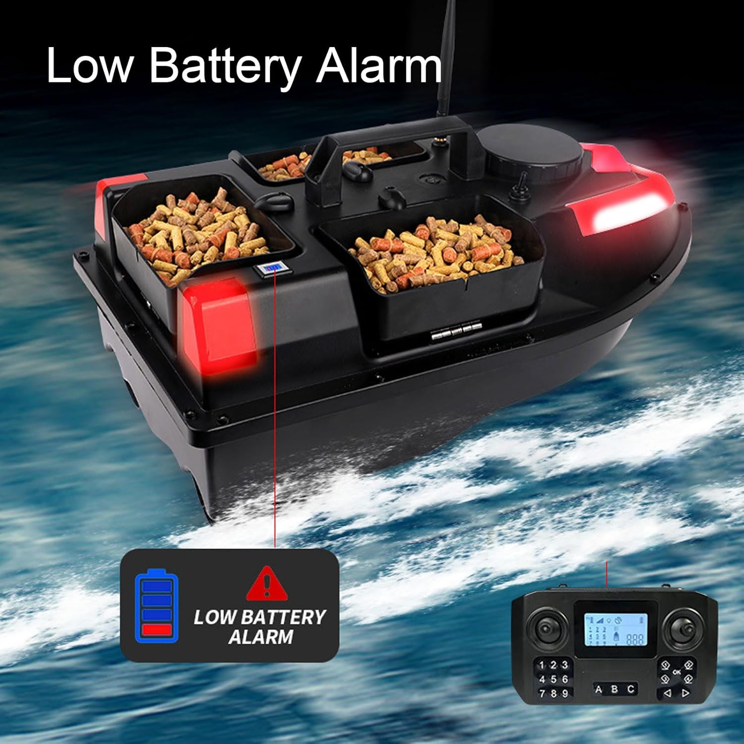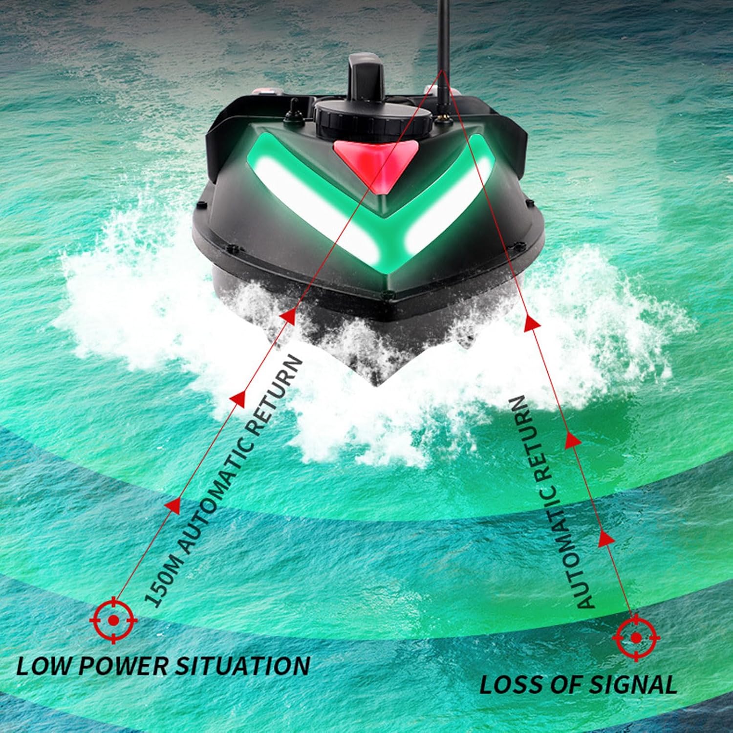 Barca da pesca: corpo in materiale tecnico ABS, con forte resistenza agli urti e all'usura, resistenza ai graffi, forte e resistenza alle onde. La barca è impermeabilizzata per prevenire efficacemente ogni tipo di infiltrazione d'acqua. Normalmente può navigare con di livello 3-4. Luce notturna: questa barca da pesca RC è dotata di luce notturna, che può aiutare i pescatori a riconoscere la direzione di navigazione durante il funzionamento notturno e anche ad attirare i pesci. Guida automatica a velocità costante, raggiunge una velocità uniforme in linea retta. Batteria a lunga durata: dotata di batteria ricaricabile di grande capacità, situata al centro della barca per un migliore equilibrio e stabilità. Il design ampliato del vano batteria può ospitare fino a 12.000 mAh. (Viene fornito con batteria da 5200 mAh). Portata 500M, doppio motore: il controllo remoto può essere realizzato in un raggio di 500 metri. Con la funzione di memoria può essere lasciato cadere in un punto fisso. I potenti motori doppi con cappuccio resistente all'acqua, che possono prevenire efficacemente l'interferenza di piante acquatiche e altri detriti sull'elica. La velocità del motore può essere regolata con precisione per migliorare efficacemente il problema dell'imbardata. Allarme batteria scarica: lo schermo LCD del telecomando visualizza la potenza del corpo dell'imbarcazione e del telecomando. Quando la potenza dell'imbarcazione è bassa, la luce dell'imbarcazione lampeggerà, il telecomando emetterà a intermittenza un segnale acustico di allarme, ricordando all'utente di richiamare l'imbarcazione per sostituire la batteria, per evitare che l'imbarcazione perda il controllo e si perda.